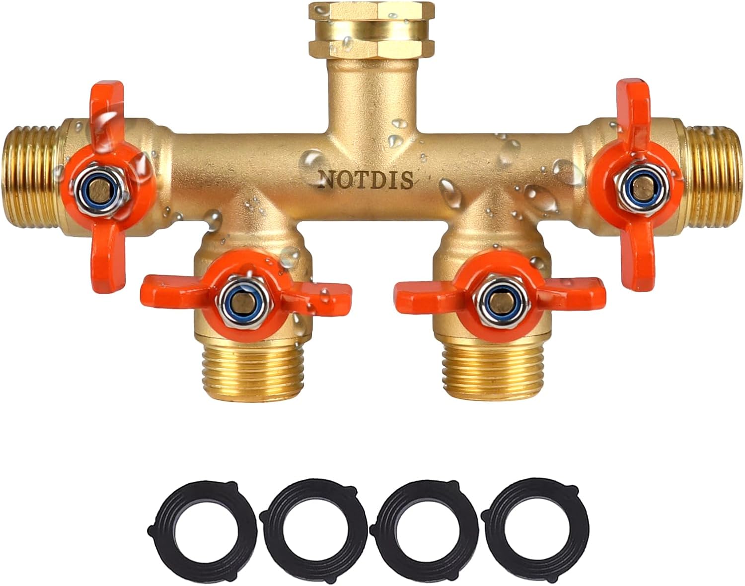 4 Way Brass Hose Splitter Full Flow with Metal Handle - Heavy Duty Spigot Splitter with Shut Off Valve, 3/4"" GHT Garden Tap Connector