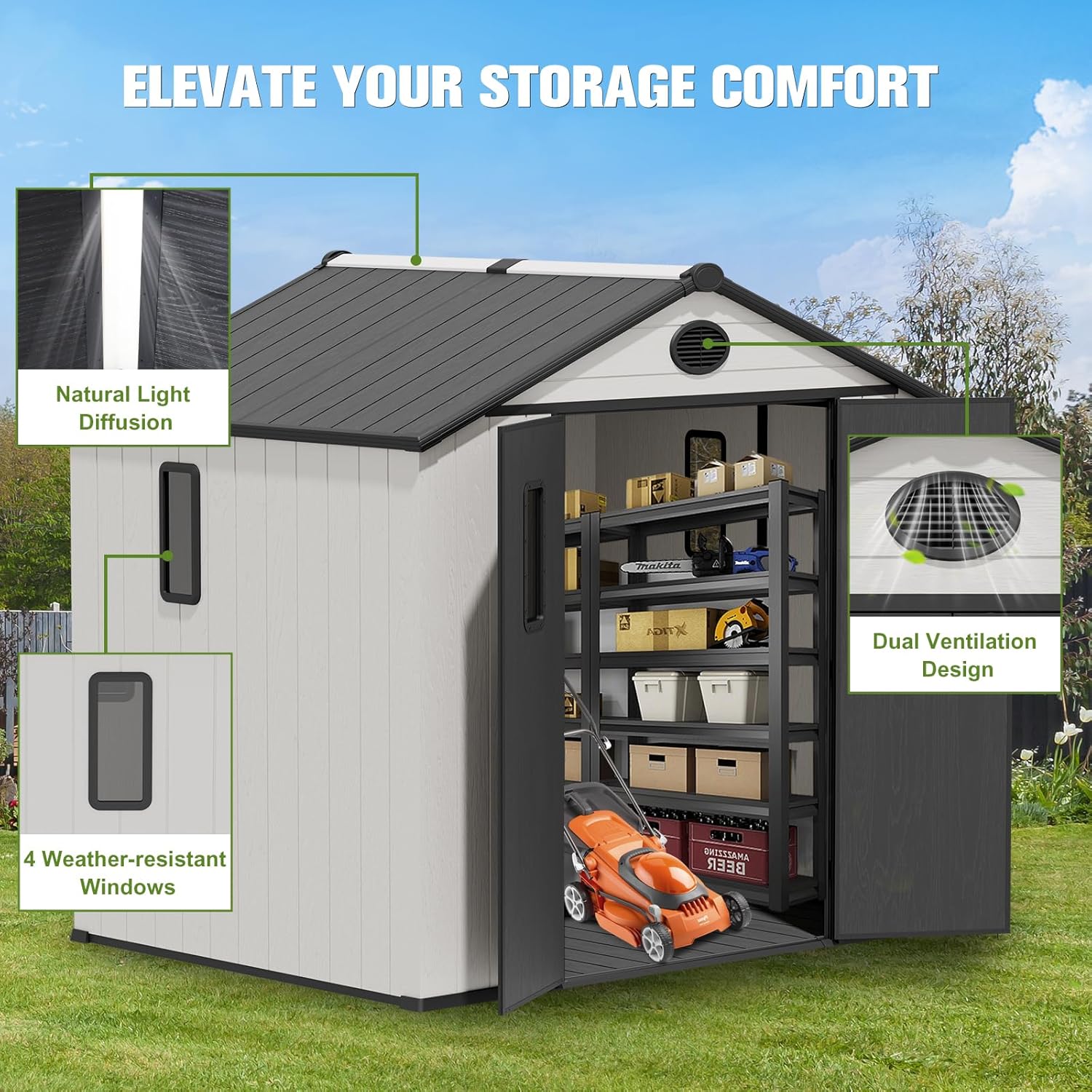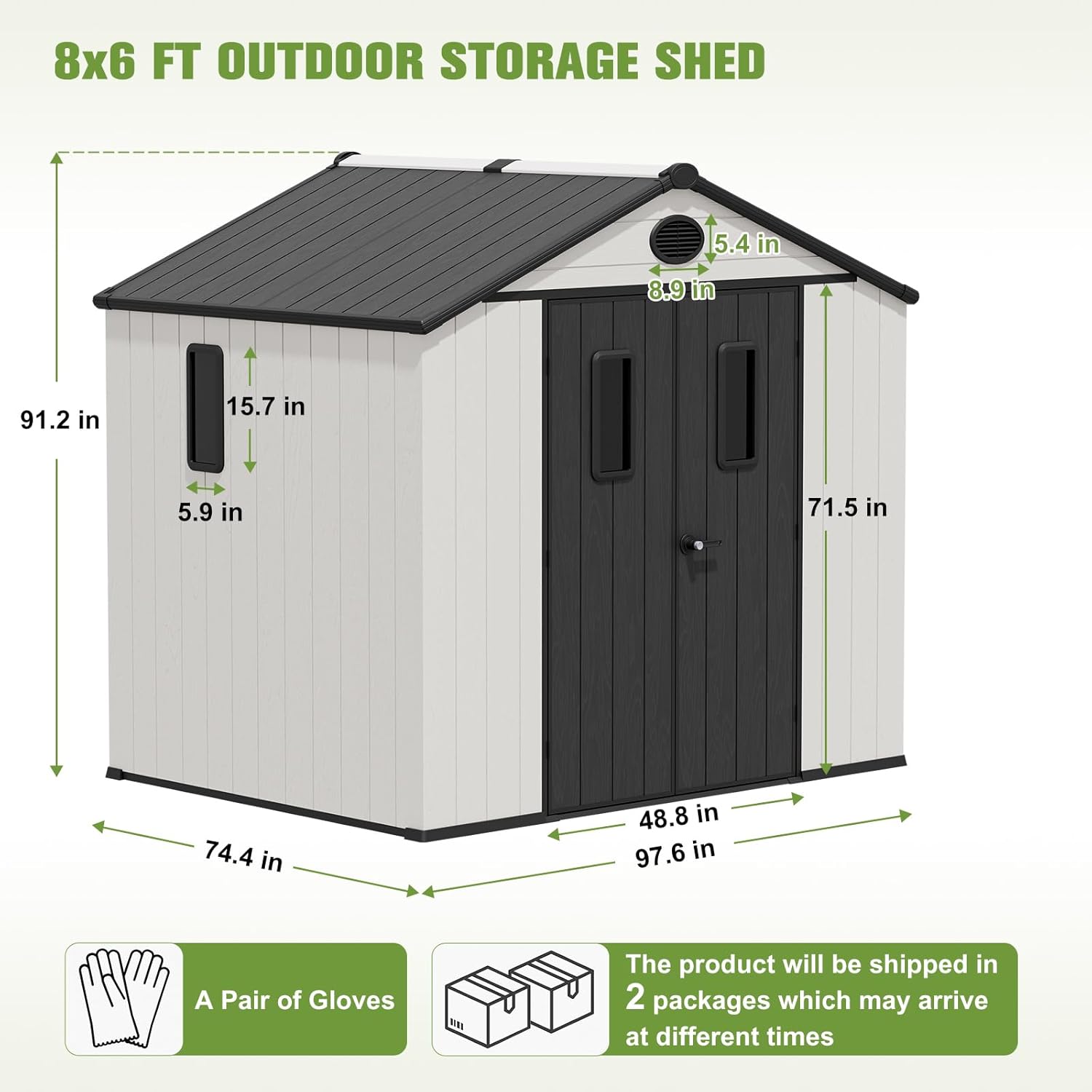 - DURABLE ALL-WEATHER CONSTRUCTION: Built with dual-wall resin panels and a reinforced steel frame, this 8x6 plastic storage shed withstands rain, sun, and snow for reliable outdoor storage year-round.