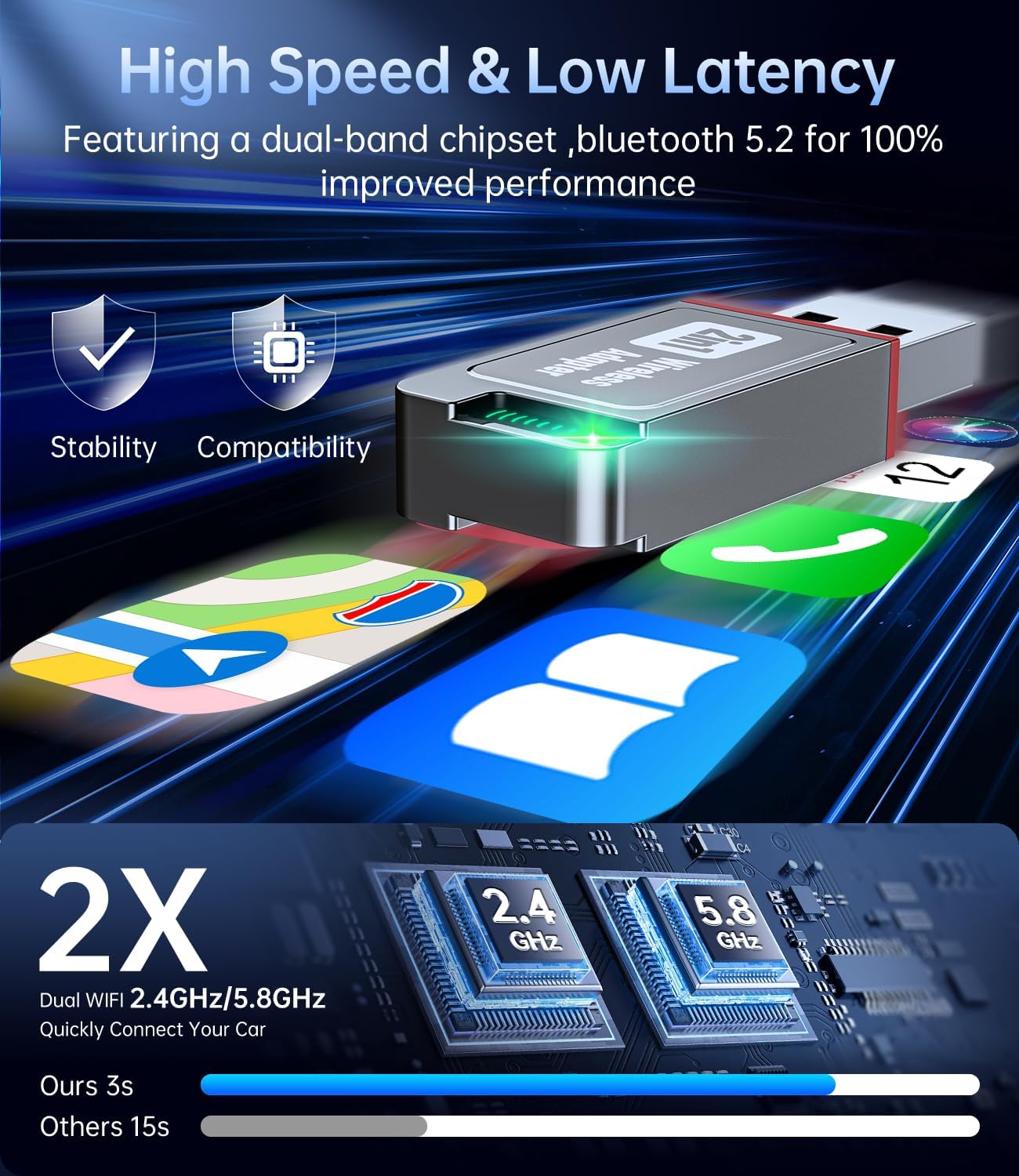 - 【Dual-Band Wi-Fi, High Speed & Low Latency】 This car play wireless adapter Featuring a 2.4GHz + 5.8GHz dual-band chipset ,bluetooth 5.2 for 100% improved performance, optimized for fast data transfer.