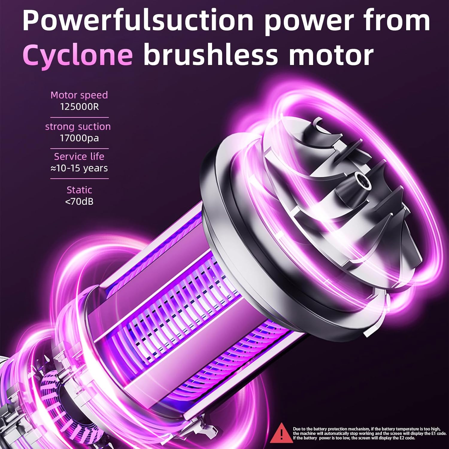 - SUPERIOR 17000PA SUCTION POWER AND BRUSHLESS MOTOR: The electric vacuum cleaner featuring an upgraded brushless motor and 17000PA of maximum suction power for quieter operation, longer motor life, and long-lasting performance. 100 speed infinitely variable speed control, experience unmatched cleaning power, you can easily tackle pet hair, crumbs, dust, and sand in car seats, sofas, and tight crevices.