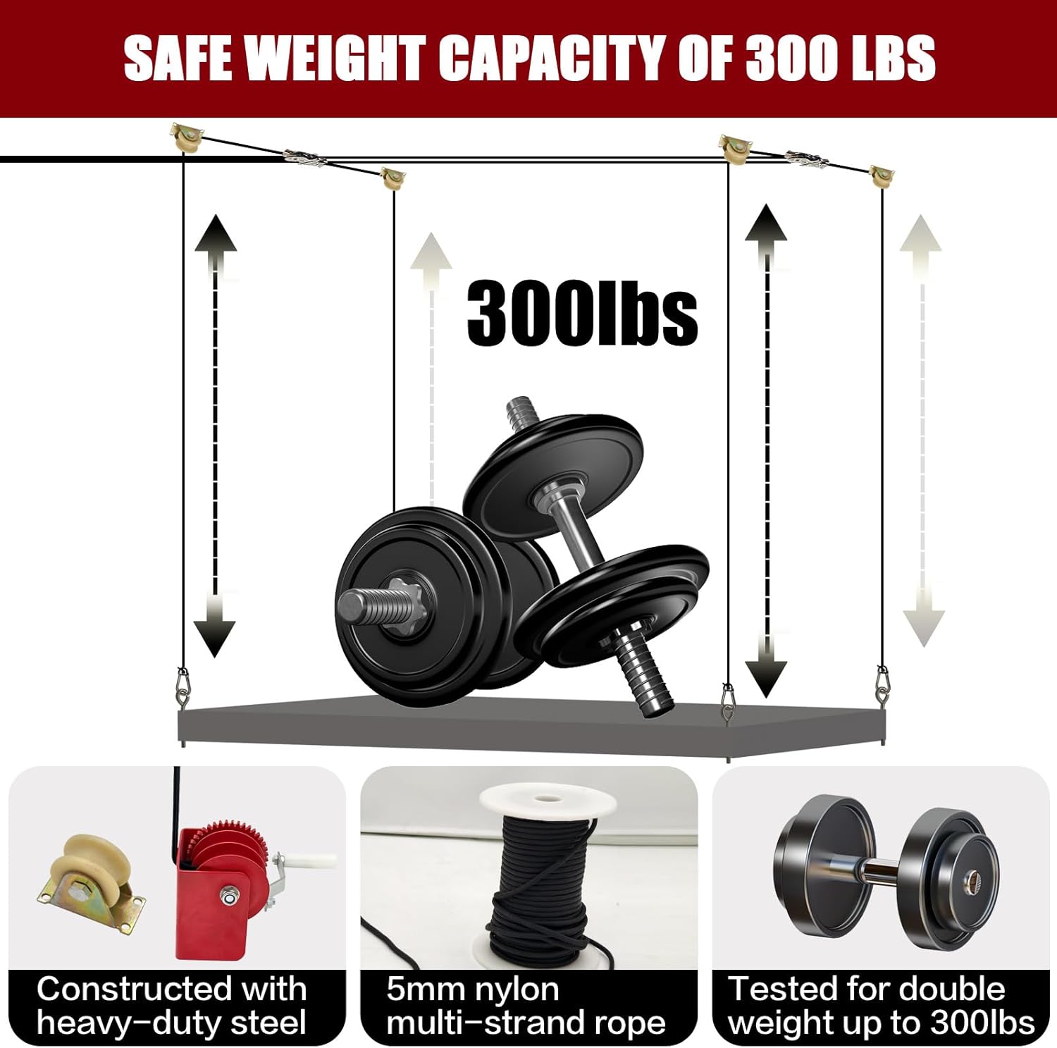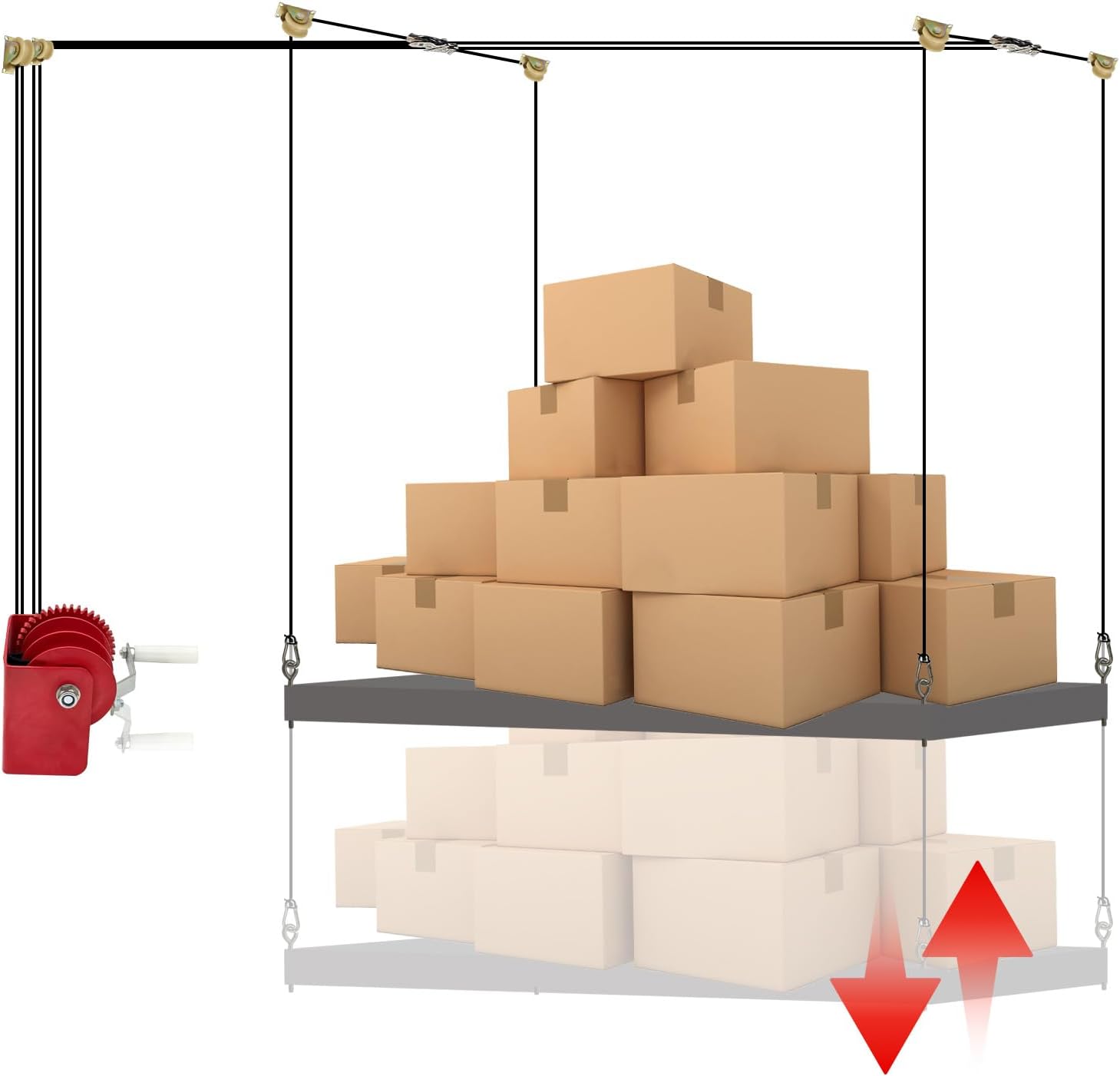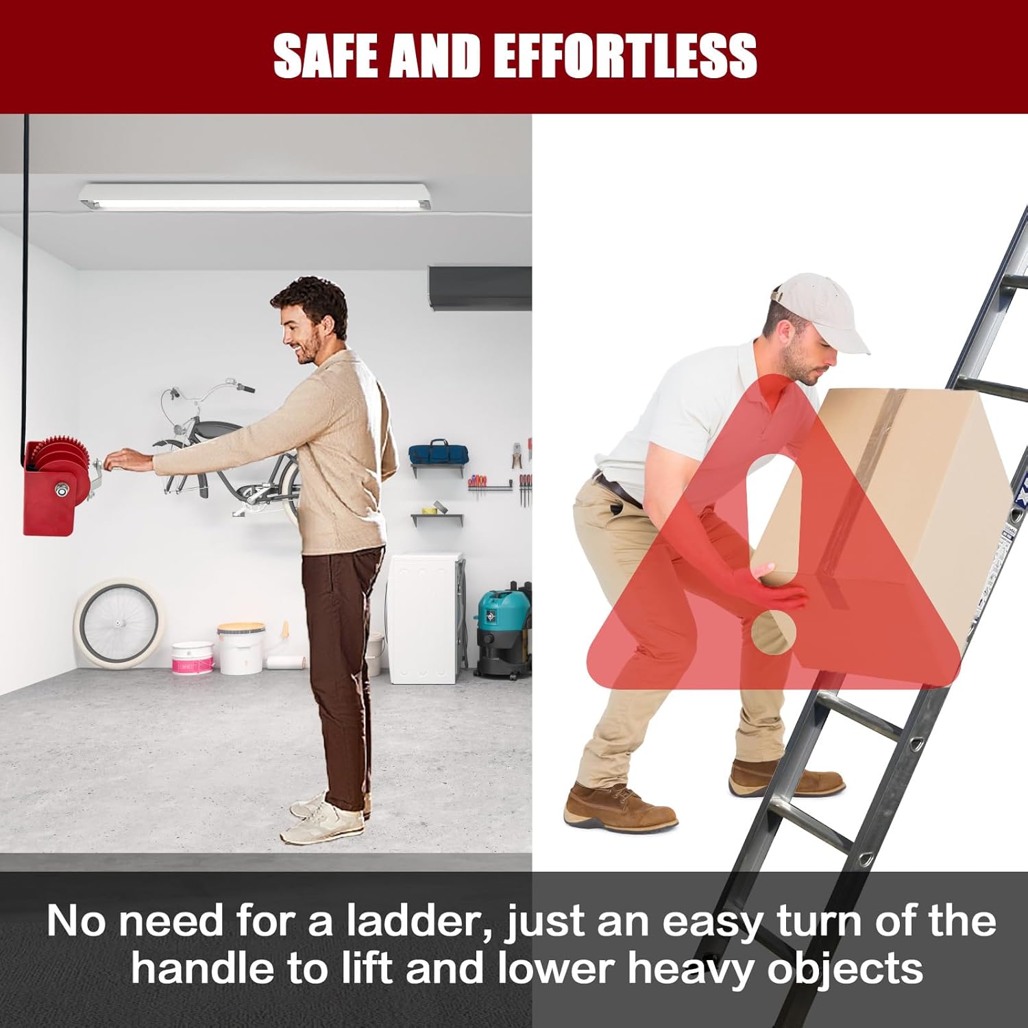 - EASY TO USE - Easily operated by one person. Our garage storage lift is equipped with a hand crank to ensure that items are easily lifted up to a maximum height of 16 feet with minimal effort, making it easy to place items without the need for a ladder.