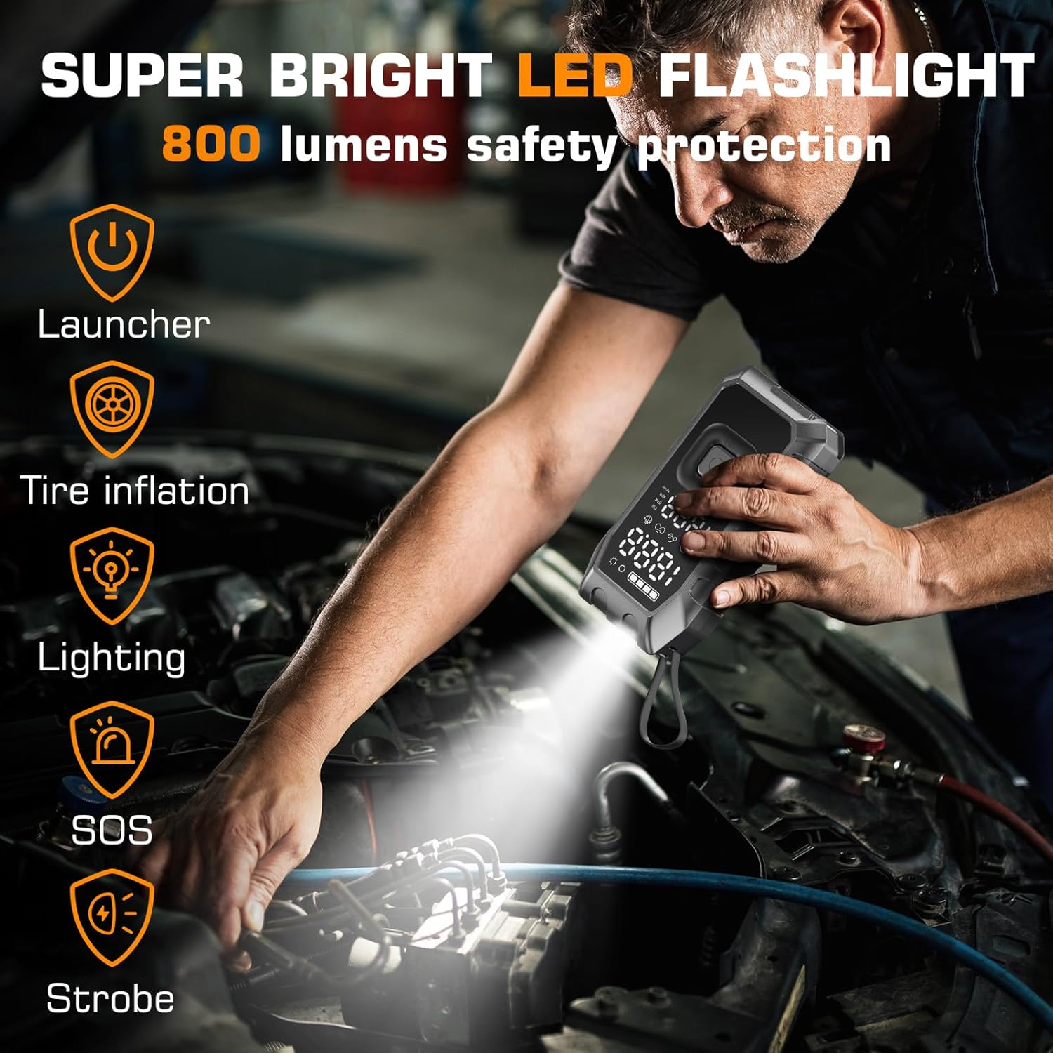 - 【Multifunctional & Professional Configuration】40cm ultra-thick pure copper cable (20% longer than ordinary models), -40℃ antifreeze rubber wrap. Comes with splash-proof spark clip, air pump hose, EVA storage bag, and multiple inflator nozzle adapters. In addition, it also integrates a 400-lumen LED flashlight with multiple lighting modes, including emergency strobe and SOS emergency rescue.