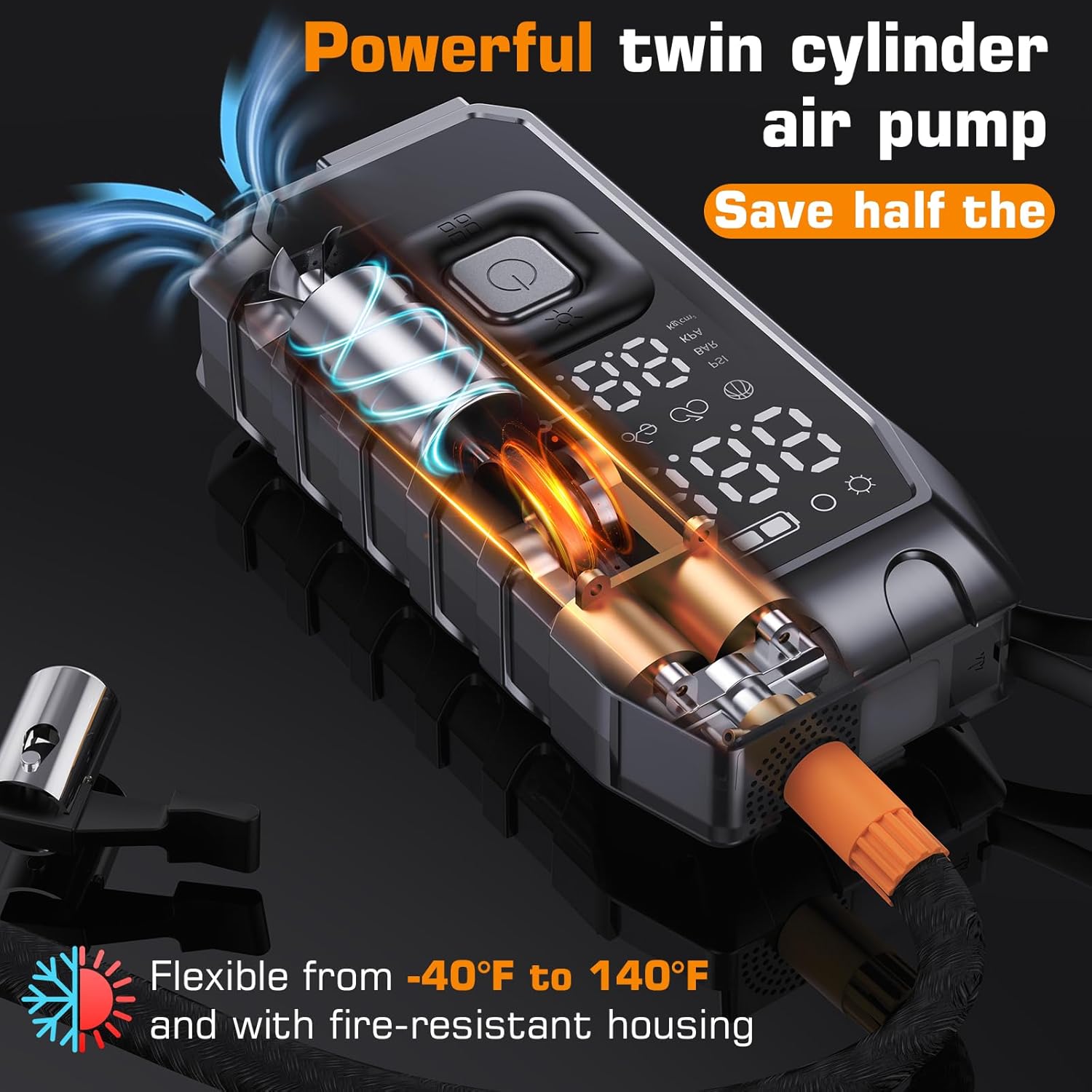 - 【LED digital display and multiple protections】Tire Inflator Portable Air Compressor is a Real-time display of power/voltage/inflation pressure, with backlighting at night. overvoltage/overcurrent/short circuit, can be started instantly even in extreme weather conditions of -20℃~70℃