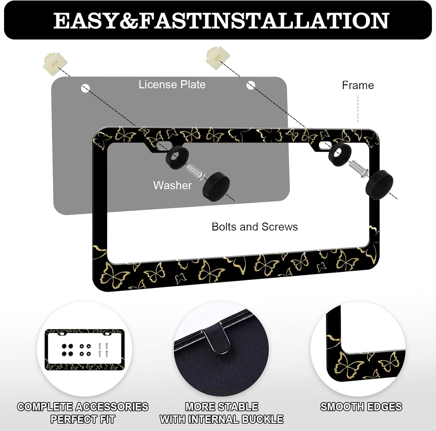 Golden Butterfly License Plate Frames - 2 Pack Beautiful Butterfly Stainless Steel License Plate Holder,Rust-Proof Waterproof Car Decorative Tag Frame with Screws Fasteners Caps