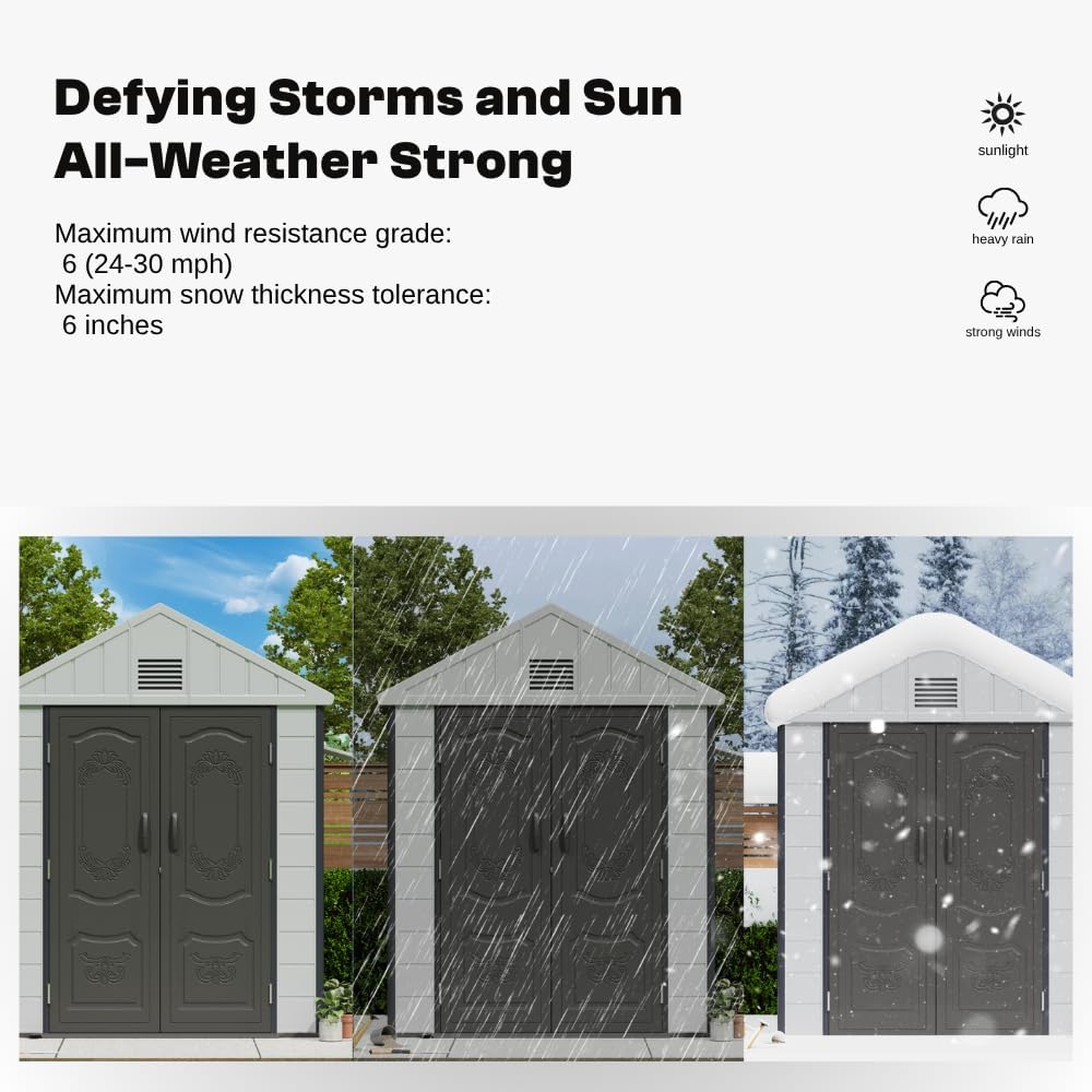 - 【Double-Wall Construction】The steel-reinforced dual-wall and impact-resistant floor are designed for long-term durability, providing resistance against insects, corrosion, and improved waterproofing. (Maximum wind resistance grade: 6 (24-30 mph); Maximum snow thickness tolerance: 6 inches.)