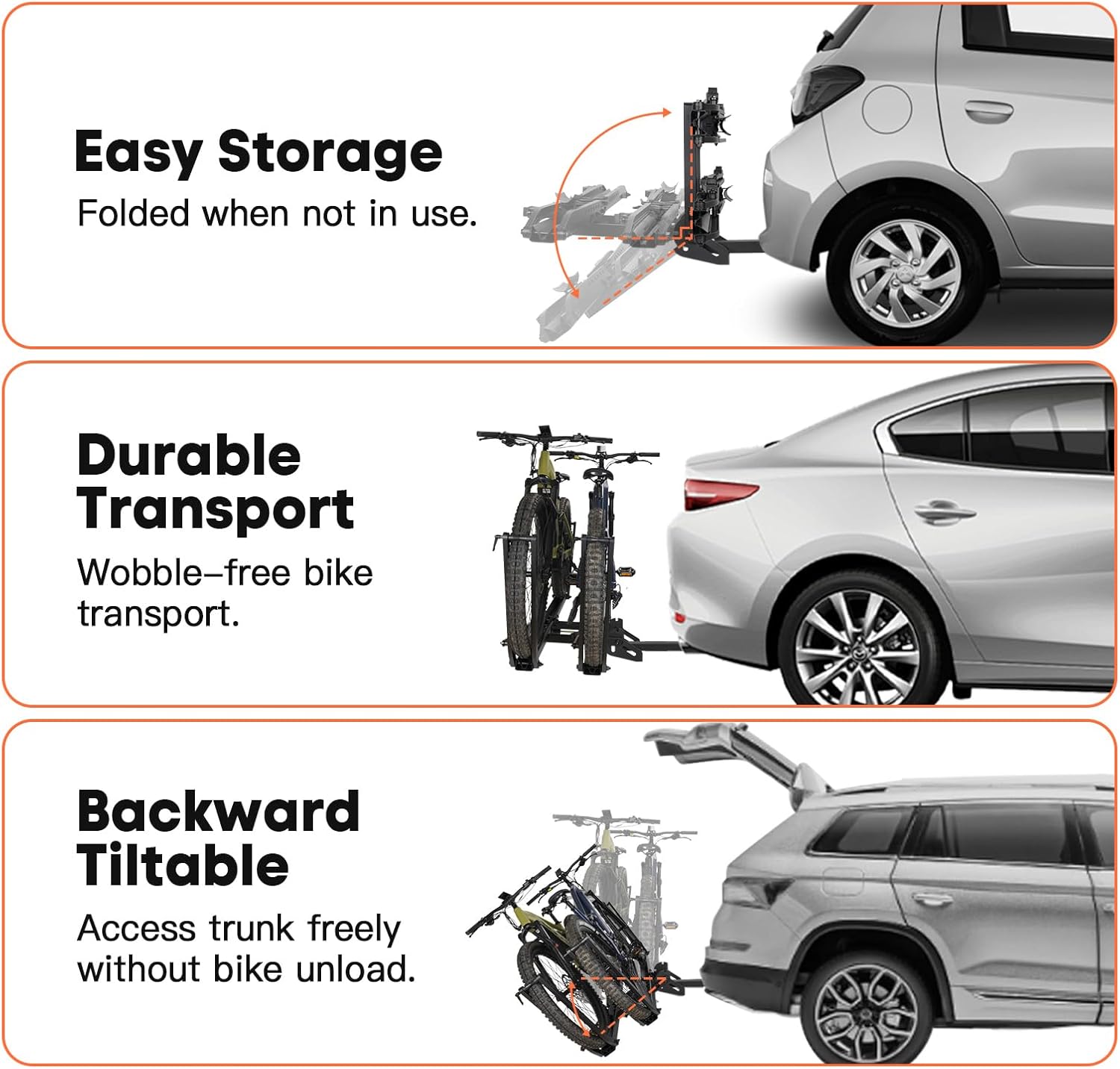 - 3-Position Adjustable: Easily fold the bike rack into three positions by pressing the handle. When not in use, you can lift it upward. For easy access to your trunk, it can be lowered to the back, or laid flat when loading your bike.