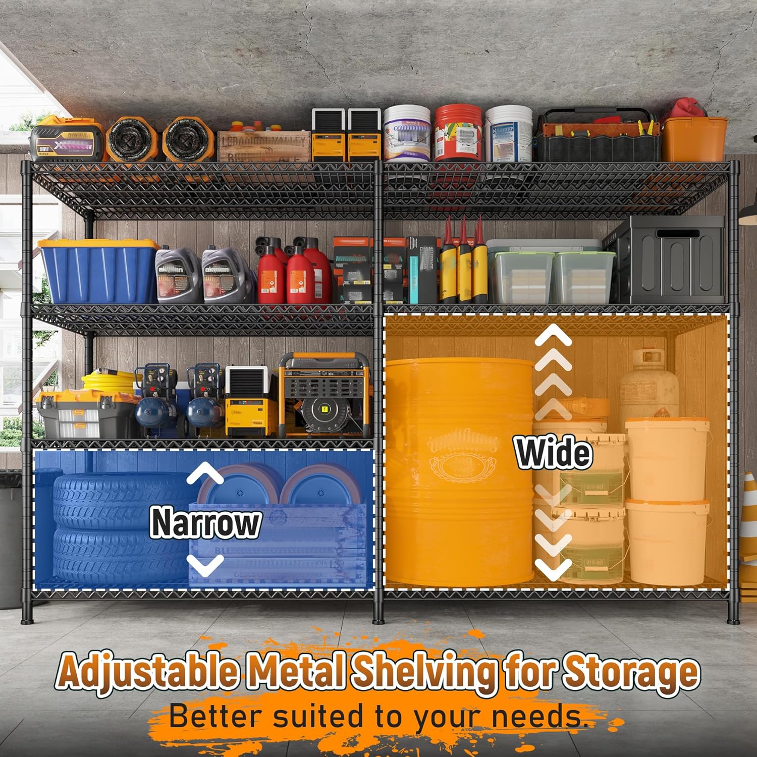 - Adjustable Garage Shelving:The adjustable and detachable shelves provide flexible storage options. Designed with adjustable clamps, the height of each layer can be customized based on the size and weight of your items, meeting a wide range of storage needs. These multifunctional shelves are ideal for kitchens, storage rooms, pantries, warehouses, basements, and more.