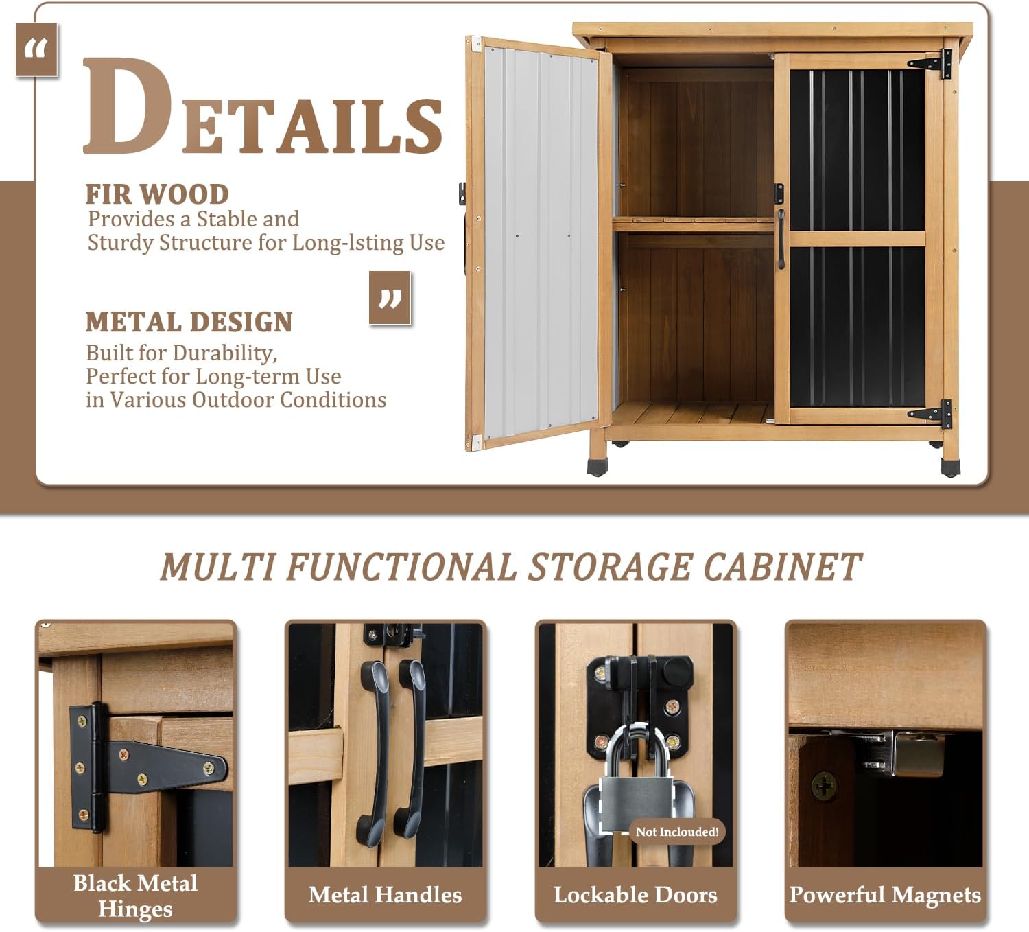 Weatherproof Outdoor Storage Cabinet with Lockable Doors, Wood & Metal Garden Storage Shed Patio Storage Box for Tools & Lawn Equipment, Pool Accessories