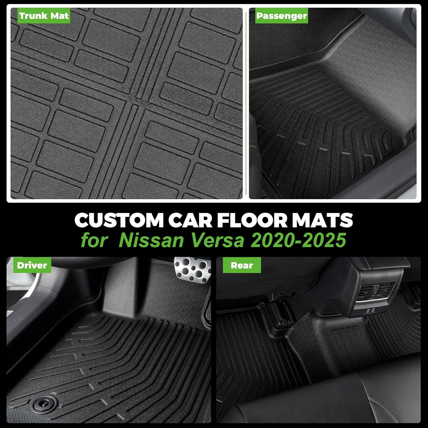 - ăPrecise FităSuitable for 2020-2025 Nissan Versa all-weather foot mats and cargo mats. Through 3D laser scanning technology, accurately cover your car carpet and fit your car like a glove. During the design process, attention was paid to details such as throttle and brakes, which will not affect your driving experience.