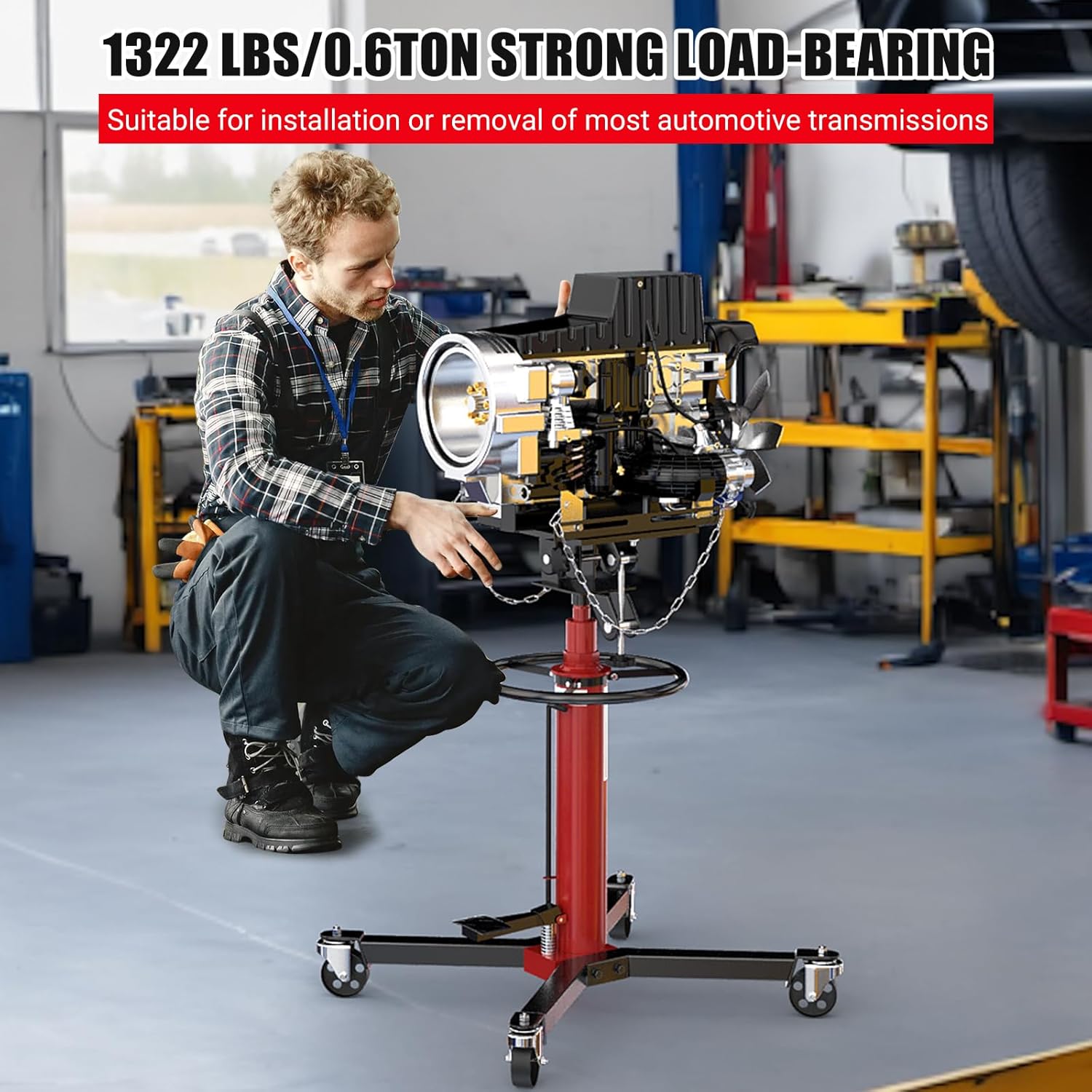 - 1322 LBS LOADING CAPACITY: Our 1322 lbs(3/5 ton) hydraulic telescoping transmission jack helps you easily guide a transmission securely. Great for any automotive or light truck transmission installation or removal. See where the problem is and solve it with a quality transmission jack.