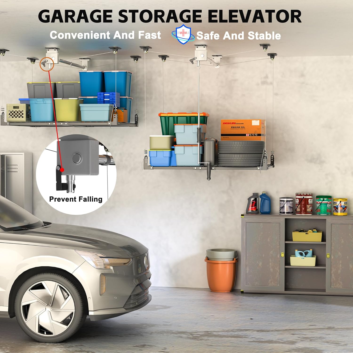 - 4x4FT DURABLE METAL SHELF: The heavy-duty garage lift is made of sturdy steel and can support weights up to 400 pounds. It is durable and perfect for safely storing bulky garage items such as tires,kayaks,camping outfit,ensuring stability and safety during heavy loads.