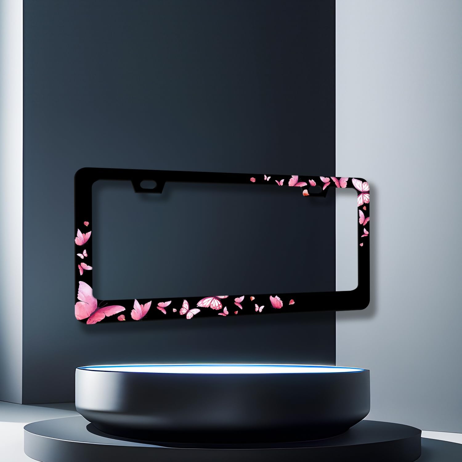 Butterfly License Plate Frame Pink Butterflies License Plate Stainless Steel Funny Accessories Cars Decor 12.2 X 6.2 Inch with 2 Holes and Screws Fits Standard Us Ca Vehicles