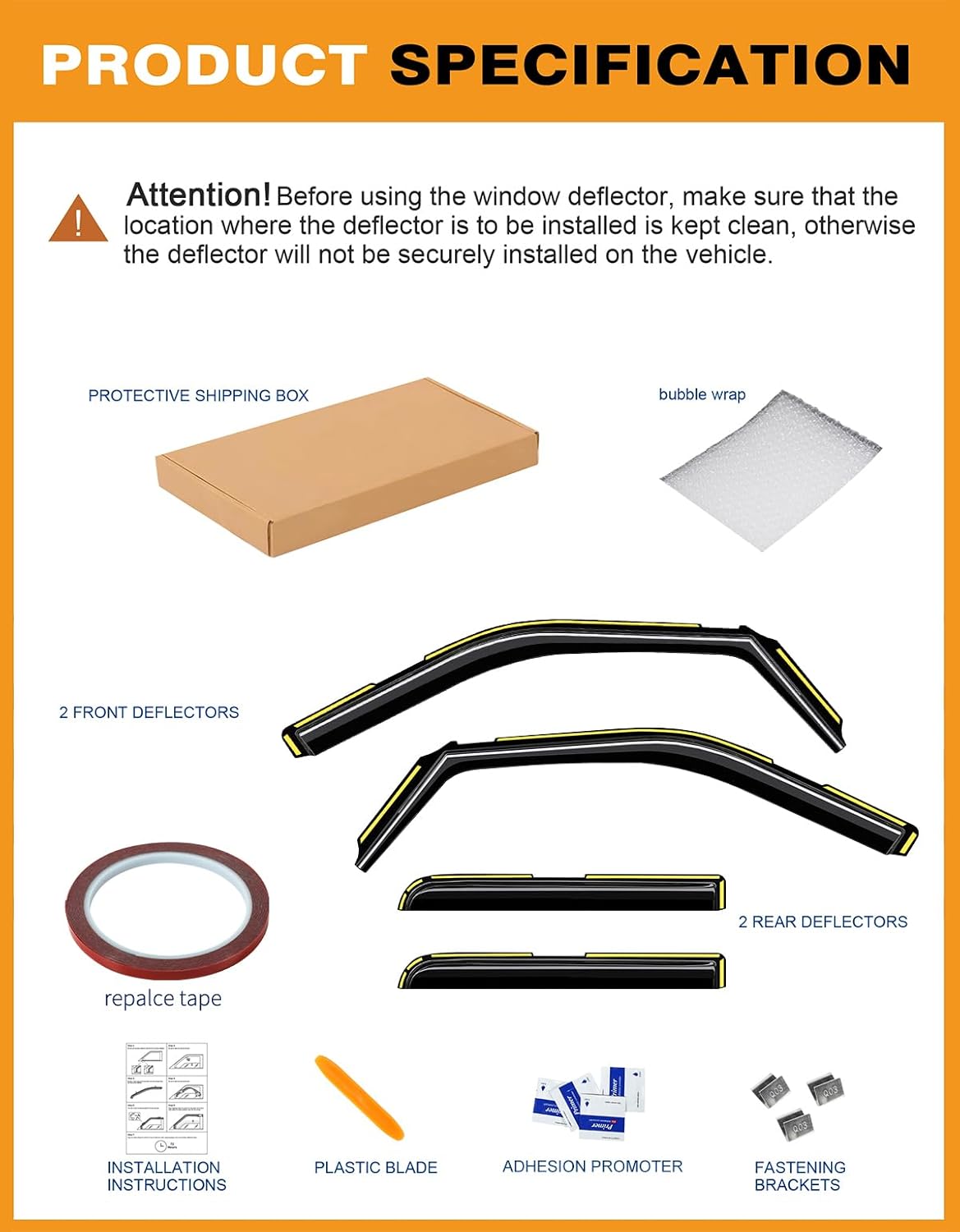 - ăFull-size Side Window DeflectorsăThis 4-piece set includes passenger, driver side rain guards that create a seamless look that protects you from sun rays, rain drops, and wind while youâre driving with the window down.