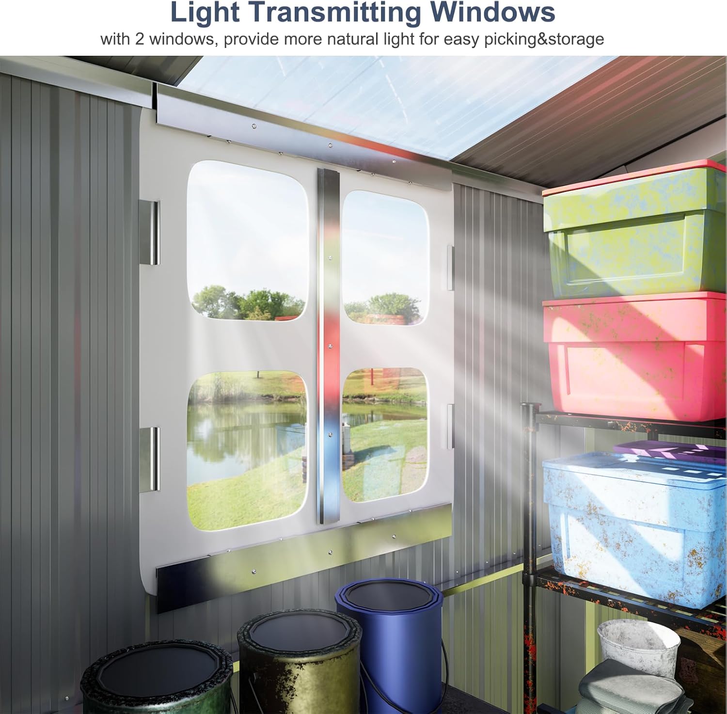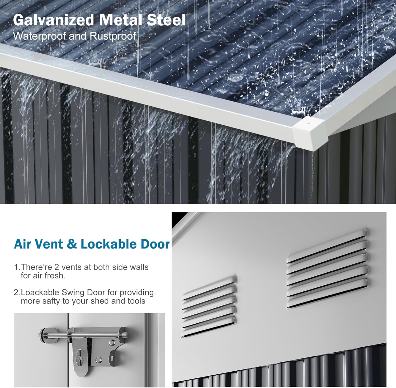 - Premium Metal Panels, All-Weather Use- The metal storage shed is made from 0.25mm color steel plate & 0.6mm galvanized sheet. It's capable of effectively resisting corrosion, oxidation, rain, and ultraviolet radiation. Easy to maintenance