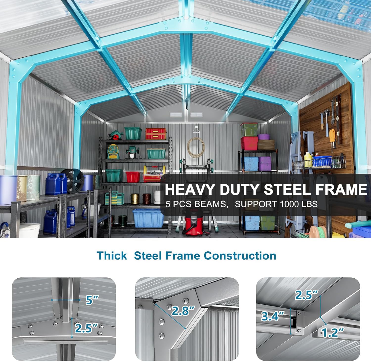 - 10x16 FT Extra Large Metal Shed- Provides spacious room for household yard tools,especially big tools like lawnmowers,wood chipper, broadcast spreader and bikes. More than just a storage shed, could be a cozy house for your pet. It adapts to various needs, making it an ideal companion for a range of outdoor activities with your family