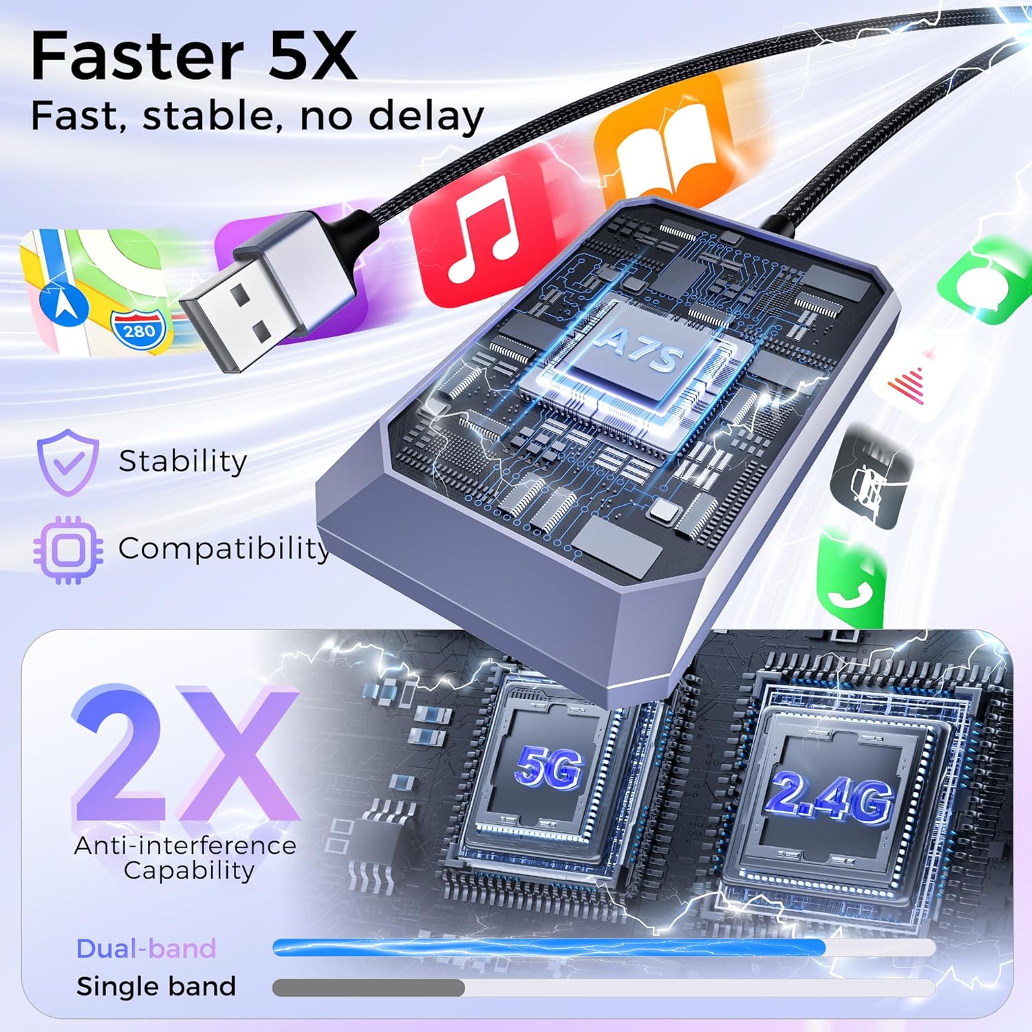 - Wide Vehicle Compatibility: This wireless CarPlay adapter is designed for cars with OEM wired CarPlay. Includes a USB-A to Type-C adapter for broader compatibility across different vehicle models and USB interfaces