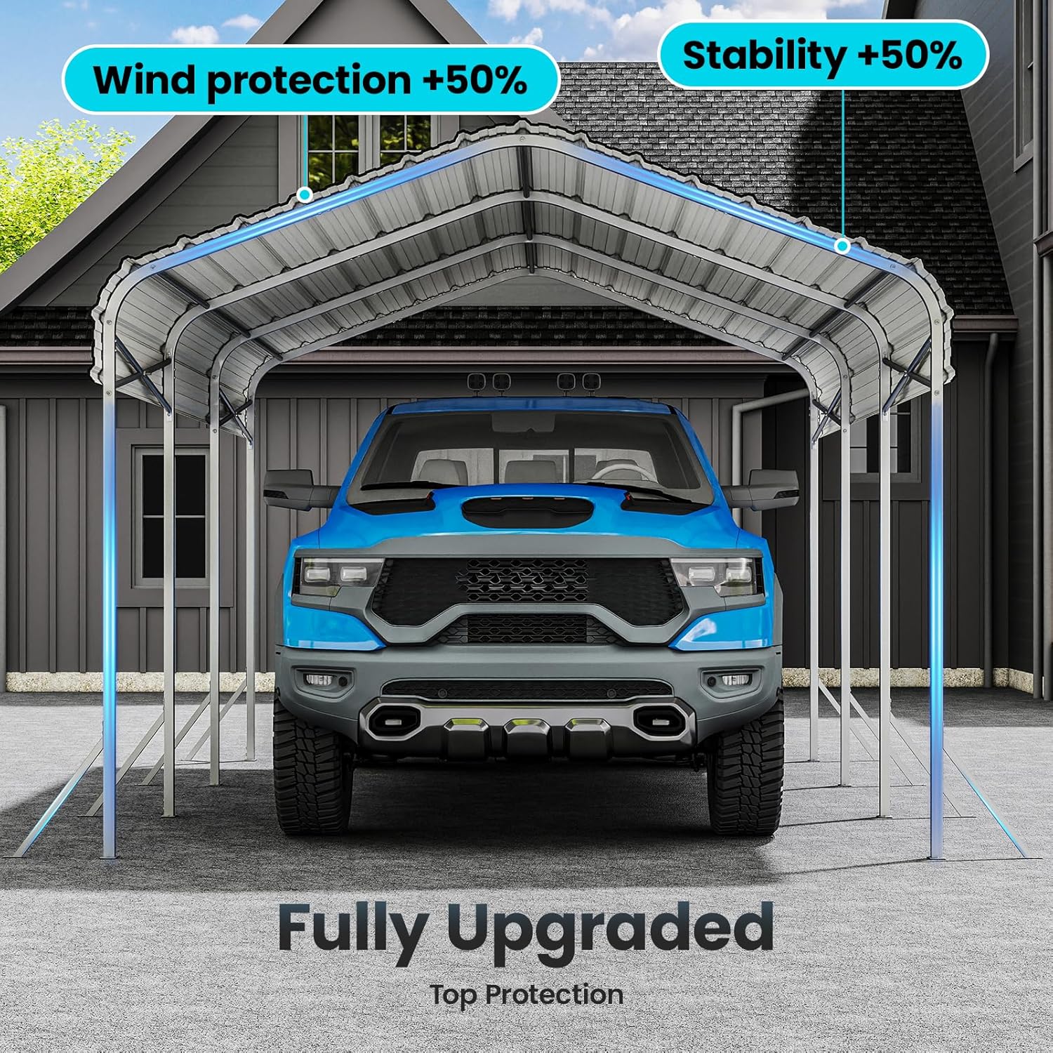 - All-Weather Protection: Sturdy 2‘’ x 2‘’ frame and 27-gauge sheet metal roof provide reliable protection for your vehicle and outdoor equipment from rain, snow, and sun all year round