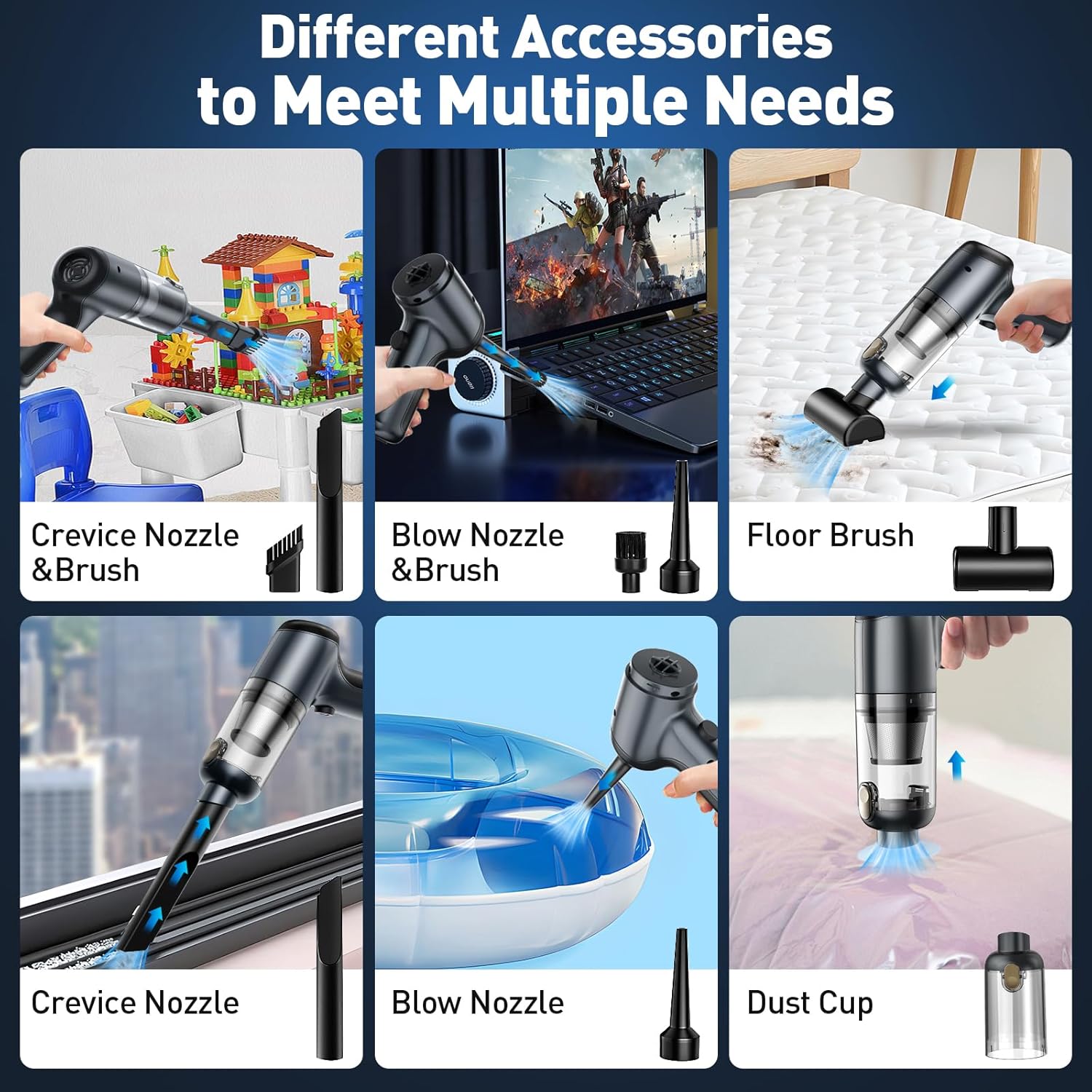 - Mini Vacuum Cleaner: Cordless car vacuum cleaner has different accessories to meet daily different cleaning needs: sucking, blowing, inflation and vacuuming. Small vacuum cleaner has strong suction, floor brush, suction nozzle and brush can help clean up dust, debris, and other tiny particles, the other end of the vacuum cleaner is the blowing and inflating function, blowing nozzle accessory you can easily blow away the dust inside the crevice of the keyboard or inflate air mattresses and swim rings.
