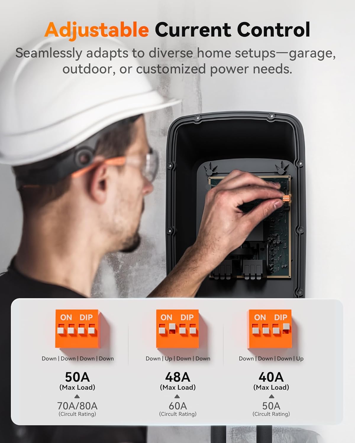 - Adjustable amperage: Match the dial code with your home's distribution panel manually—Reduce overload risk. Perfect for older 20A circuits or upgraded 70A systems.