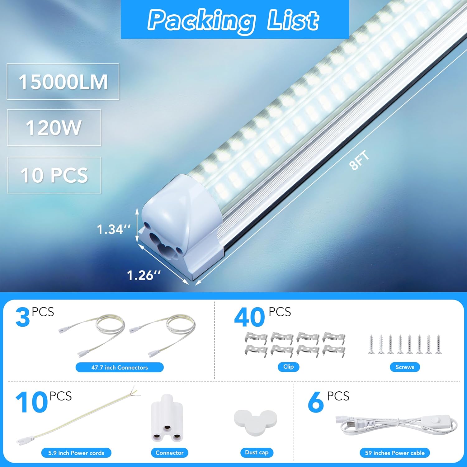 - [Ultra-Bright 270° V-Shape LED Shop Lights]Get commercial-grade brightness! Our 8FT LED lights feature 160LM/W & a 270° V-shape design for uniform, flicker-free daylight (6000-6500K). Perfect garage led lights or workshop led light fixture, illuminating every corner. Outshines fluorescents, slashes energy costs.