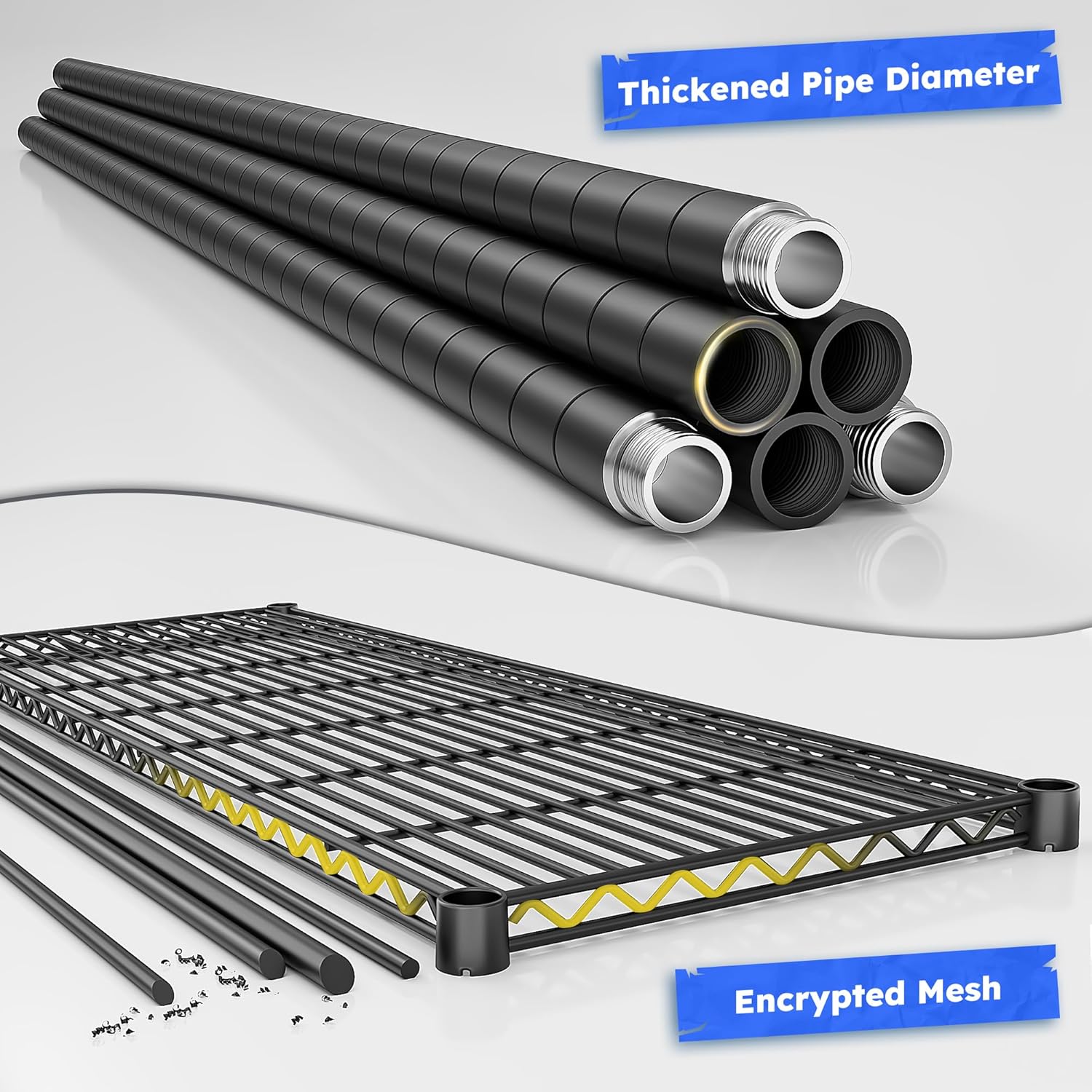 - 45âW Extra-Wide Storage Shelves:Our wire closet shelving measures 45âW Ă 13.5âD Ă 59.4âHâoffering nearly twice the capacity of standard black shelves. The 45-inch ultra-wide design easily stores bulky kitchenware, toolboxes, green plants, bulk food packs, seasonal clothing, files,books and more, making it perfect for home or commercial use.