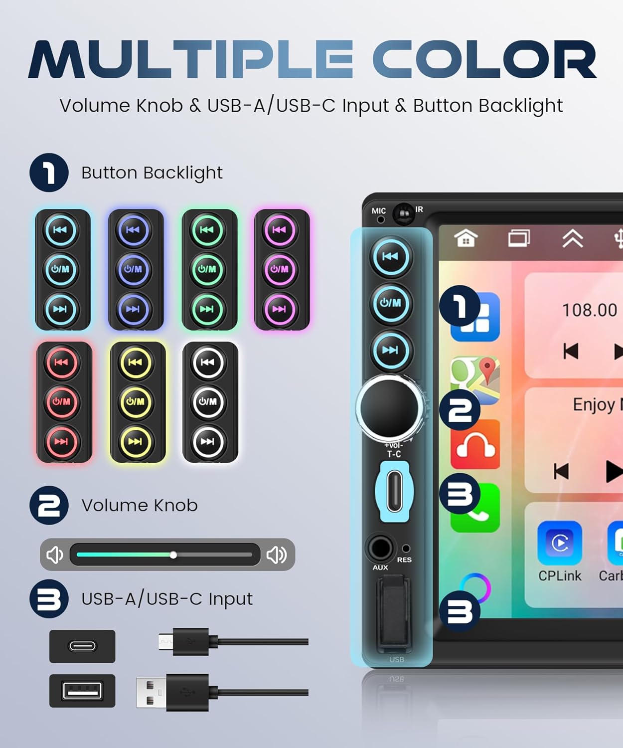 - [Volume Knob & Button Backlight & USB-A/USB-C Input]: Designed for convenience and style, it features a tactile volume knob for easy control, customizable button backlighting for night driving, and dual USB-A/USB-C inputs to support modern charging and data transfer needs.