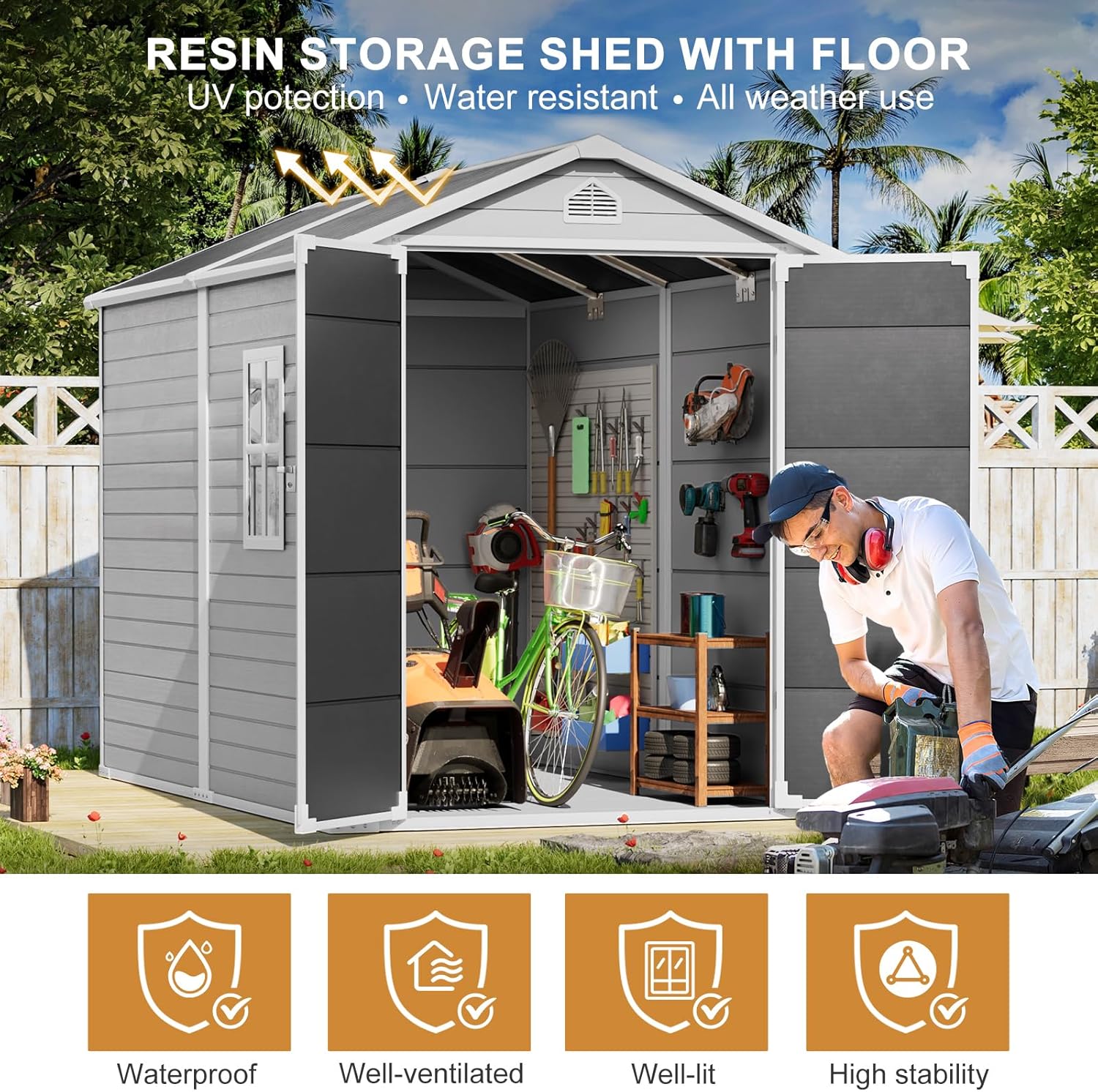 Restland 8x6 FT Resin Storage Shed with Floor, Waterproof Outdoor Plastic Sheds with Window for Backyard Garden Patio Lawn Tools, Gray