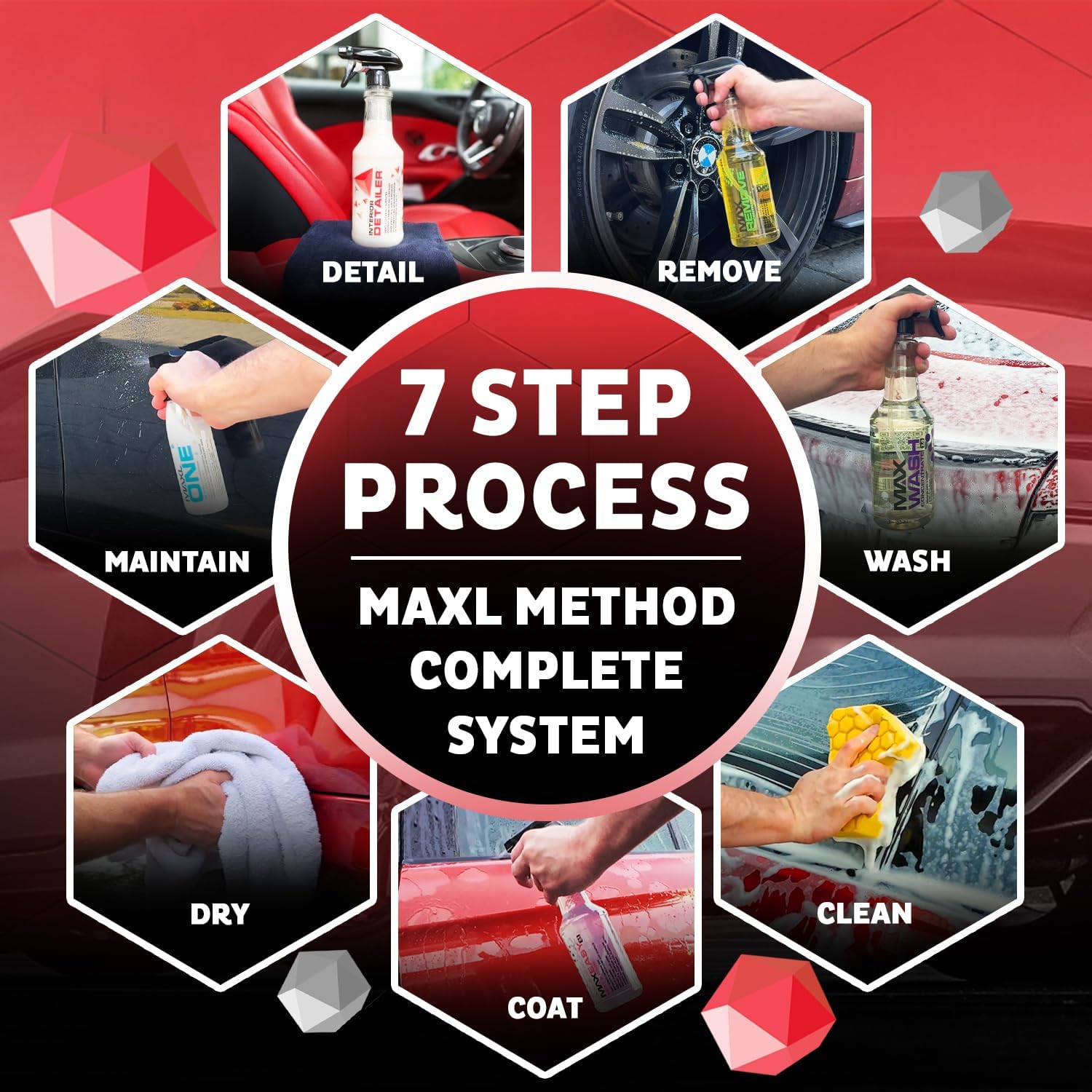 - The MAXL Method car detailing kit includes 9 essentials: MAXRemove, MAXWash, MAXEasy, MAXLONE with Triphene, Interior Detailer, YellowCell Sponge, SoftSorb Drying Towel, dilution bottles, and microfiber towels. Covers prep to finish for deep cleaning, gloss, and protection in one system.