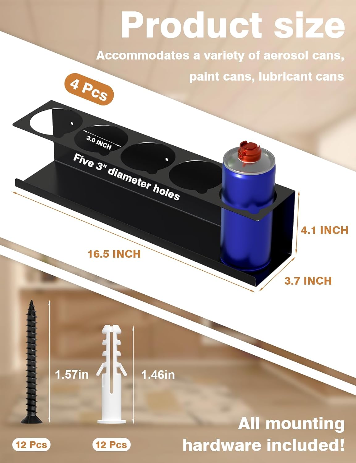 - Ample Storage Capacity - The bottle holes of this metal spray can storage rack are 3" in diameter, each shelf can hold 5 cans, the package includes 4 brackets and mounting accessories, which can hold up to 20 cans. Perfect for storing cleaning supplies, handyman tools, car care products, hair spray or any other aerosol products.