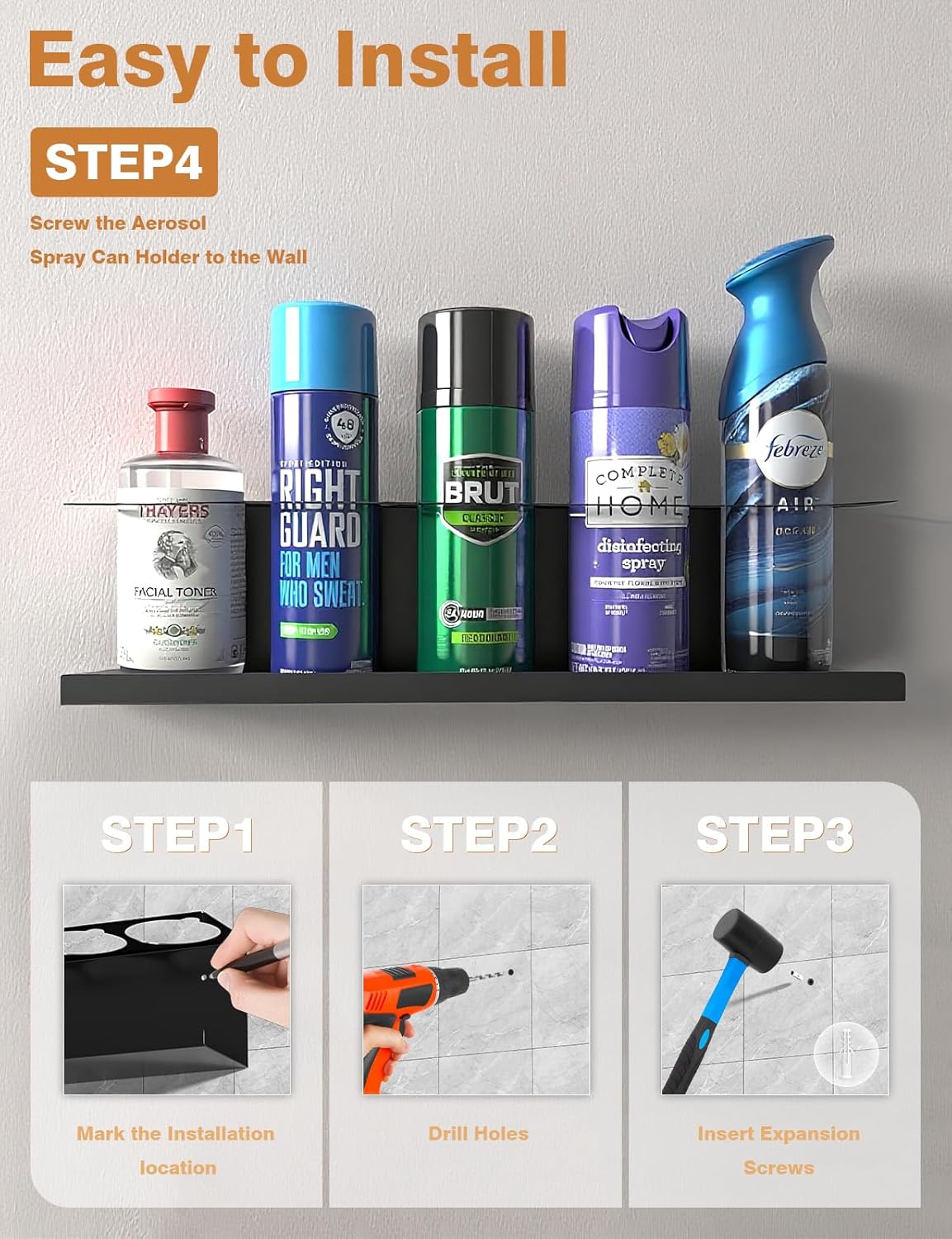 - Easy to Install - No assembly required, the spray can holder organizer is pre-punched and you can use the included mounting screws to mount the bracket on a tool box, cart or wall for easy installation