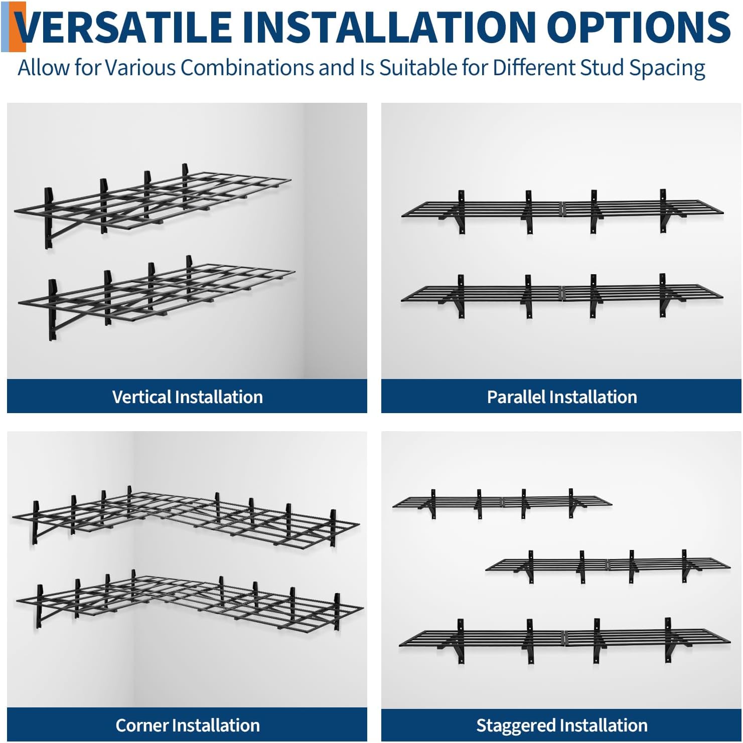 - Versatile Design: With its low-profile bracket design and the ability to be mounted side-by-side or stacked, this 2-pack shelving unit offers versatile storage solutions for garages, small pantries, or kitchens.