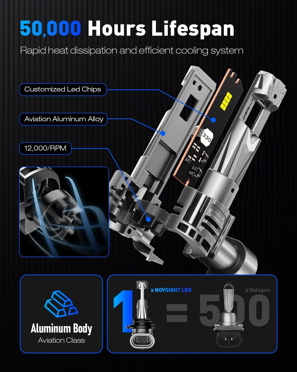 NOVSIGHT H11 9005 Fog Light Bulbs - 80000LM 6500K Cool White, 1:1 Design Easy Installation, Non-Polarity Plug-and-Play, Pack of 4