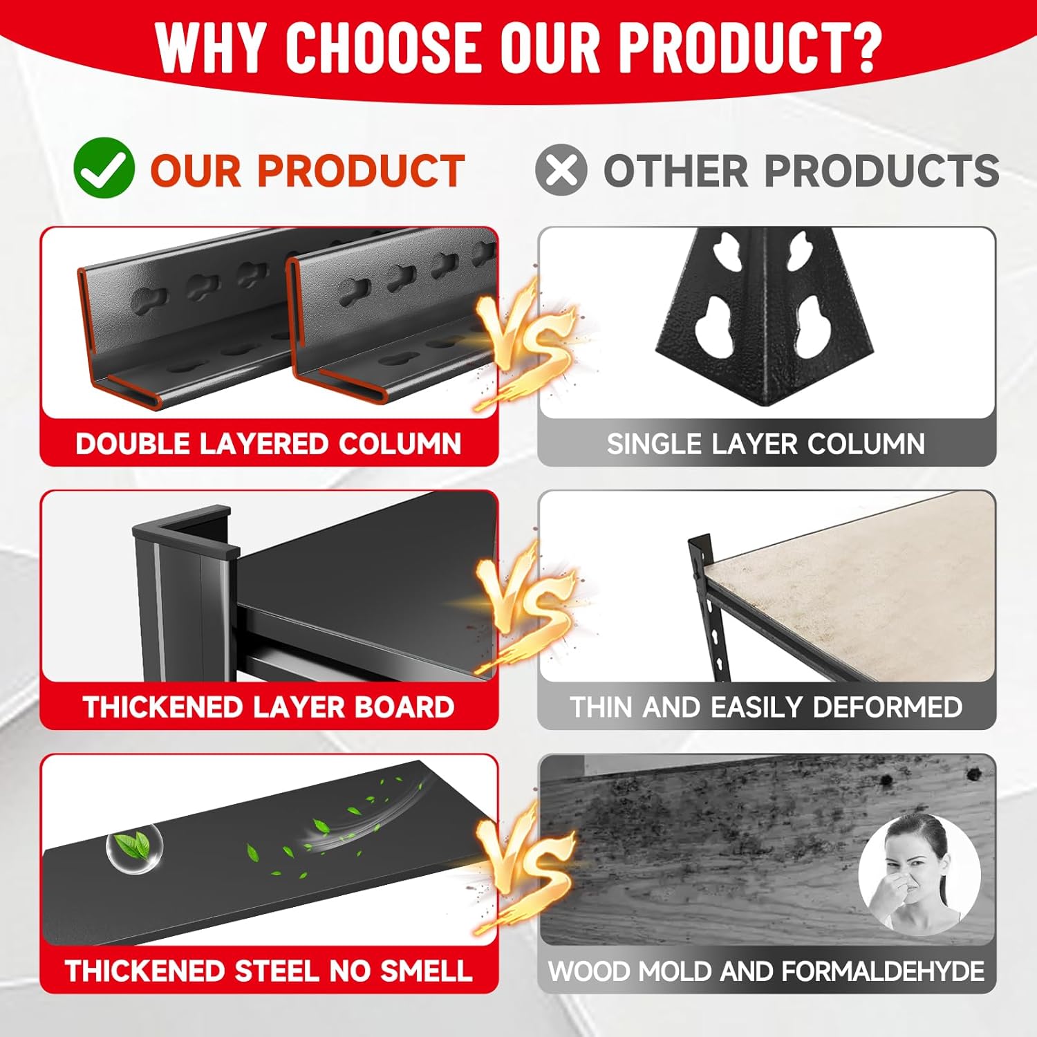 - ăThickened steel load capacity up to 3500LBSă This garage shelving is made of high-quality thickened cold-rolled steel, with a load-bearing capacity that is 30% thicker than ordinary steel. Double layered column design has stronger load-bearing capacity compared to single-layer columns, with a maximum load-bearing capacity of 3800LBS and a single-layer load-bearing capacity of 760LBS