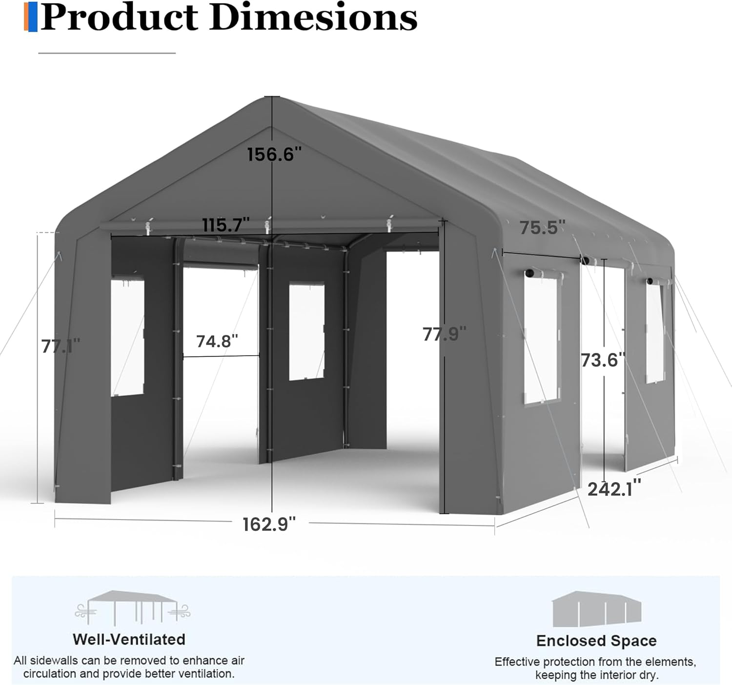 - 【Upgraded Carport】We added a rear door and 4 windows to the original, which can better promote the ventilation of the carport. 13'x20' size can also be used for family gatherings, parties and other events, with plenty of space.