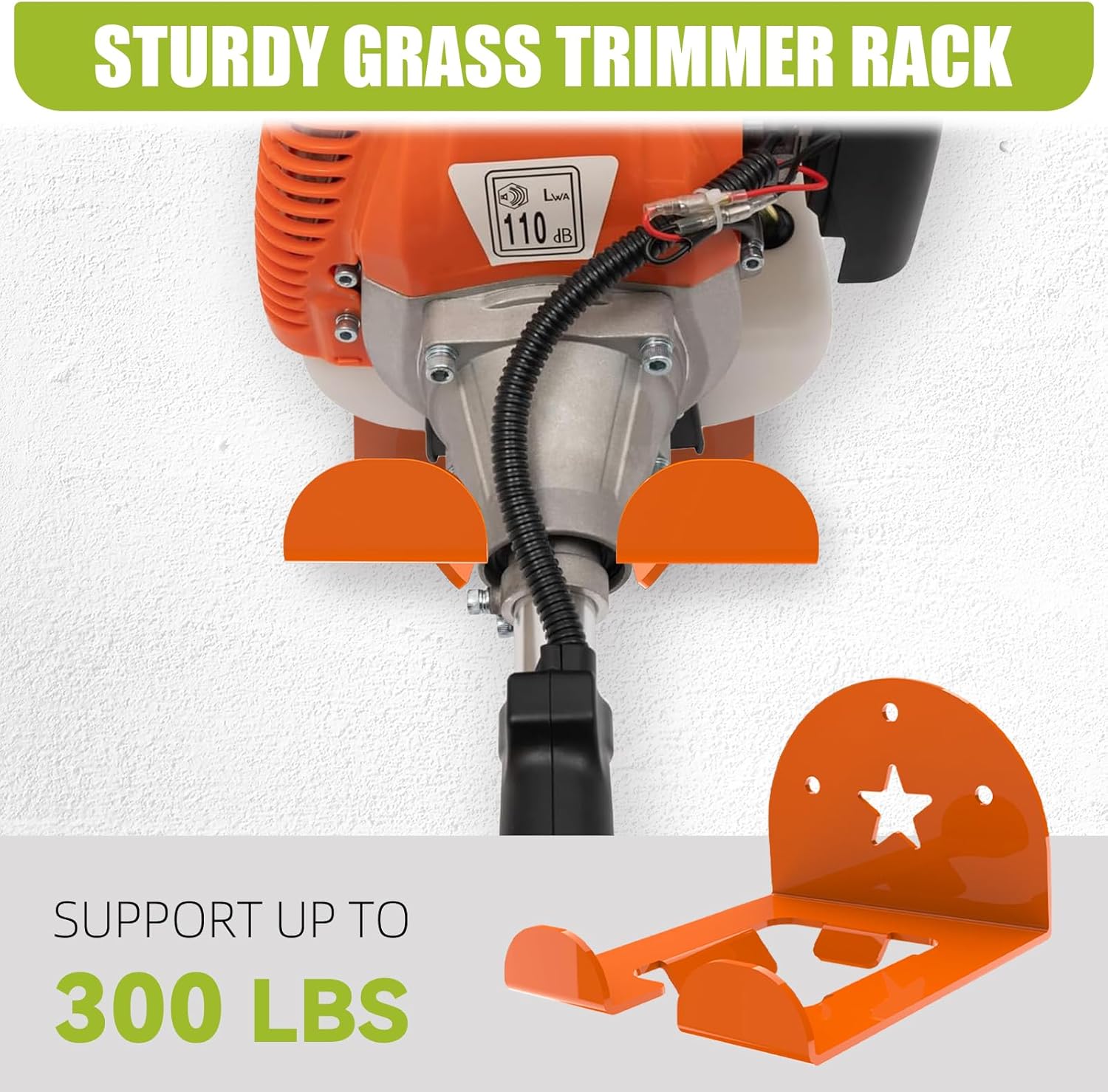 - 【Heavy Duty】The trimmer rack is made of alloy steel(300LB load capacity),which can stably hold your equipment. Each bracket features a durable orange powder coating and is paired with accessories coated in a black anti-rust layer, easily withstanding harsh environments such as humid garages and windy, rainy gardens, while providing water and rust resistance.