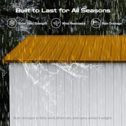 - โ [Sloped Roof for Superior Weather Protection] Designed for real-world conditions, the efficient sloped roof system guarantees optimal rainwater drainage, preventing damaging pooling and leaks. This key feature in our storage buildings and sheds clearance design minimizes maintenance and ensures your tools, equipment, and belongings stay consistently dry inside