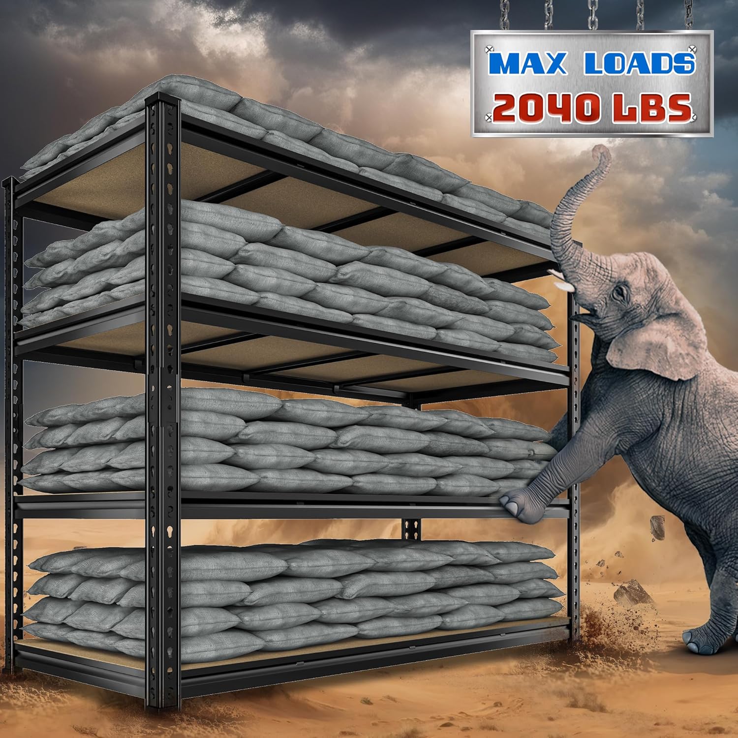 - 【2040LBS Capacity Garage Shelving Heavy Duty】The heavy duty shelving is constructed with reinforced steel legs, featuring a high-grade metal frame paired with 5mm thickened MDF boards. Every shelf of the garage storage shelves, reinforced by 3 support bars, can support up to 510LBS—delivering a total capacity of 2040LBS. The robust load capacity ensures exceptional stability and maximizes storage efficiency