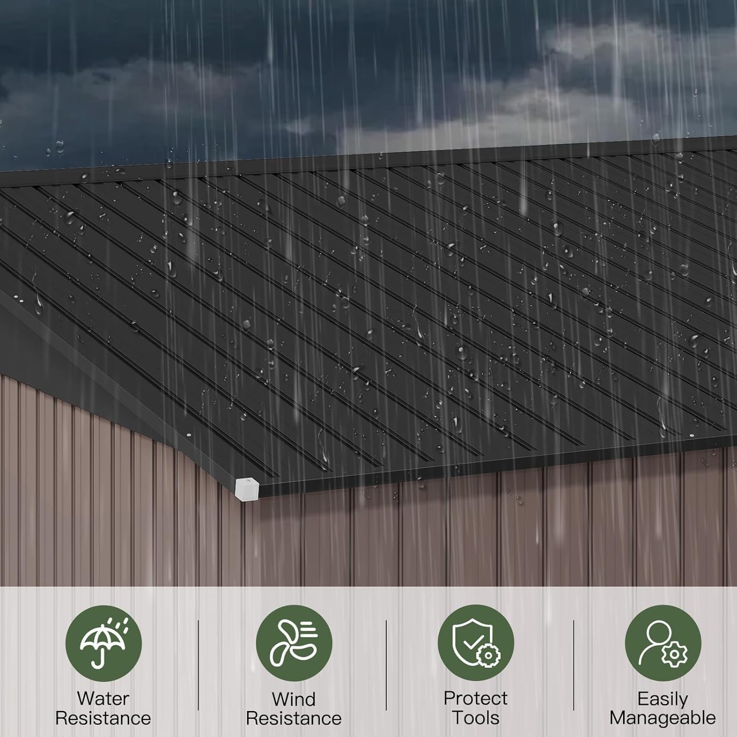- Premium Durability and Unmatched Weather Resistance: Constructed from high - quality galvanized steel, our tool storage shed is completely waterproof and engineered to withstand the toughest weather conditions, ensuring long - term reliable performance. With a sturdy metal roof and walls, it retains its shape and structural integrity, capable of enduring winds of up to 30 mph (Maximum wind resistance rating: 6) and snow accumulations of up to 6 inches.