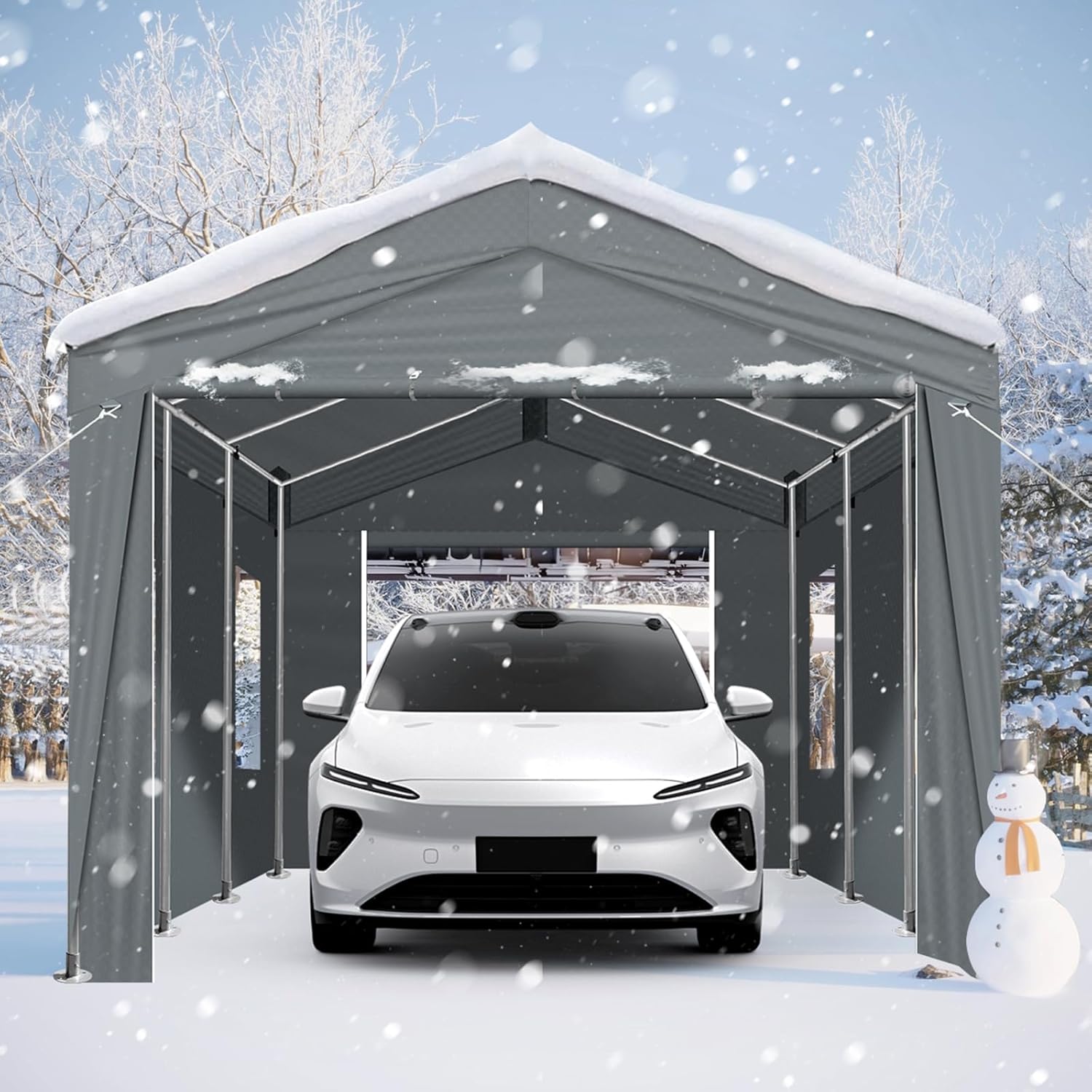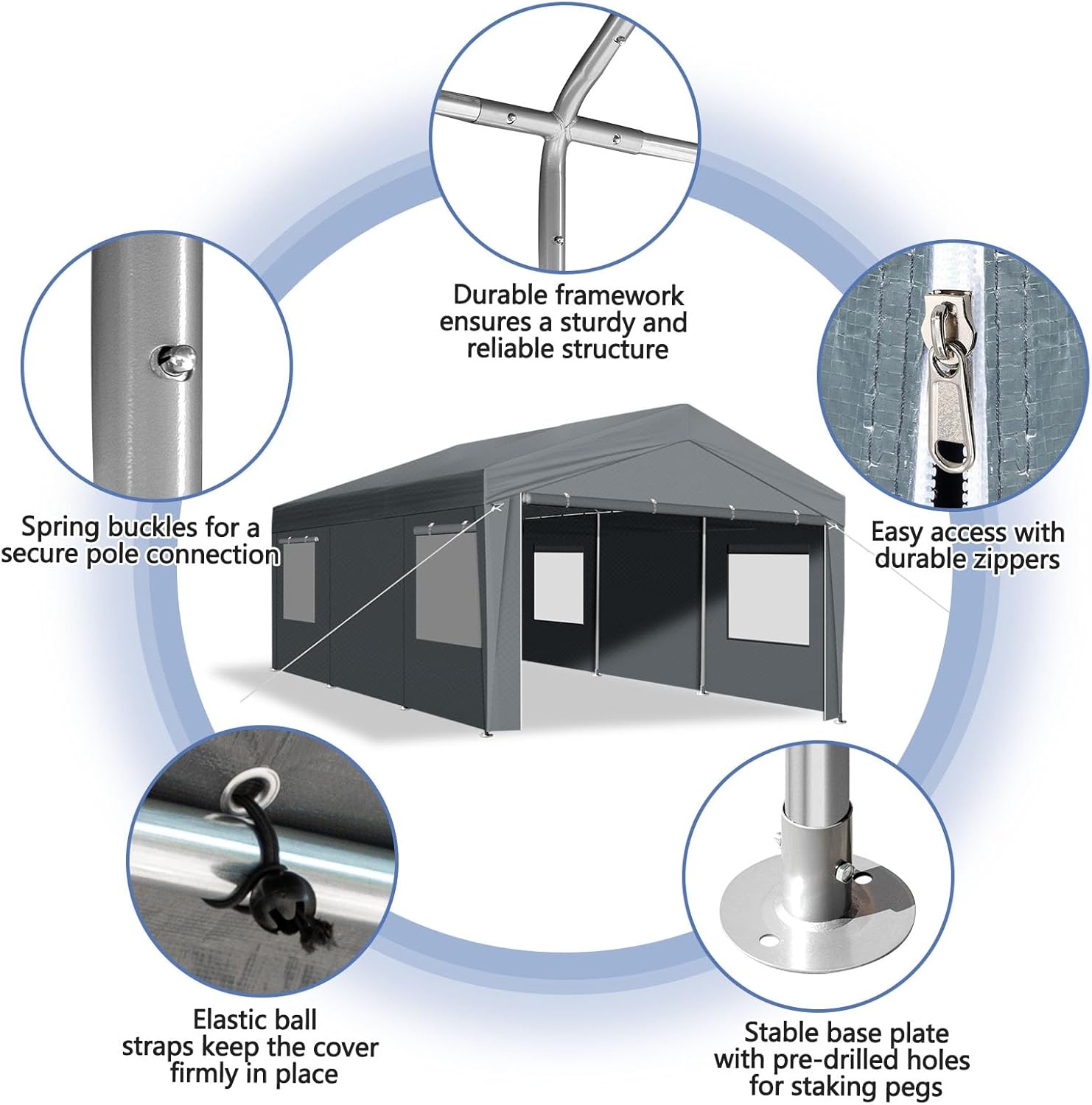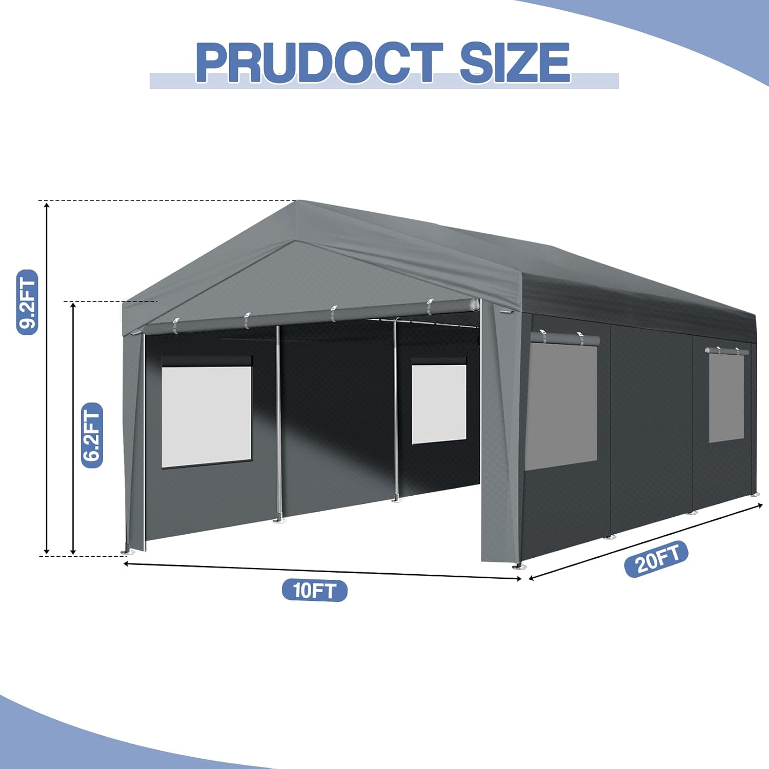 - Spacious Heavy-Duty Carport: The 10x20 car port provides ample space for your vehicles, boats, cargo, etc. Removable sidewalls and doors can meet your various needs. The carport canopy shelter is perfect for parties, commercial exhibitions, outdoor events, weddings, storage shelters, and so on