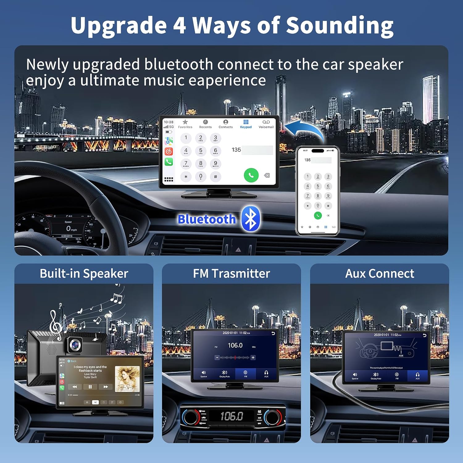 - ăStable Bluetooth 5.0 & FM Transmission & AUX CableăThe car play screen for my car plug in features Bluetooth 5.0 for a more stable connection, and listens to the radio, weather forecasts and news in real-time. This portable carplay screen equipped with a built-in speaker. For louder sound, effortlessly stream audio to your car's factory speakers via Bluetooth Connection (via Carplay or Android Auto), FM transmission, or AUX cable. Versatile Audio Integration for Ultimate Entertainment.