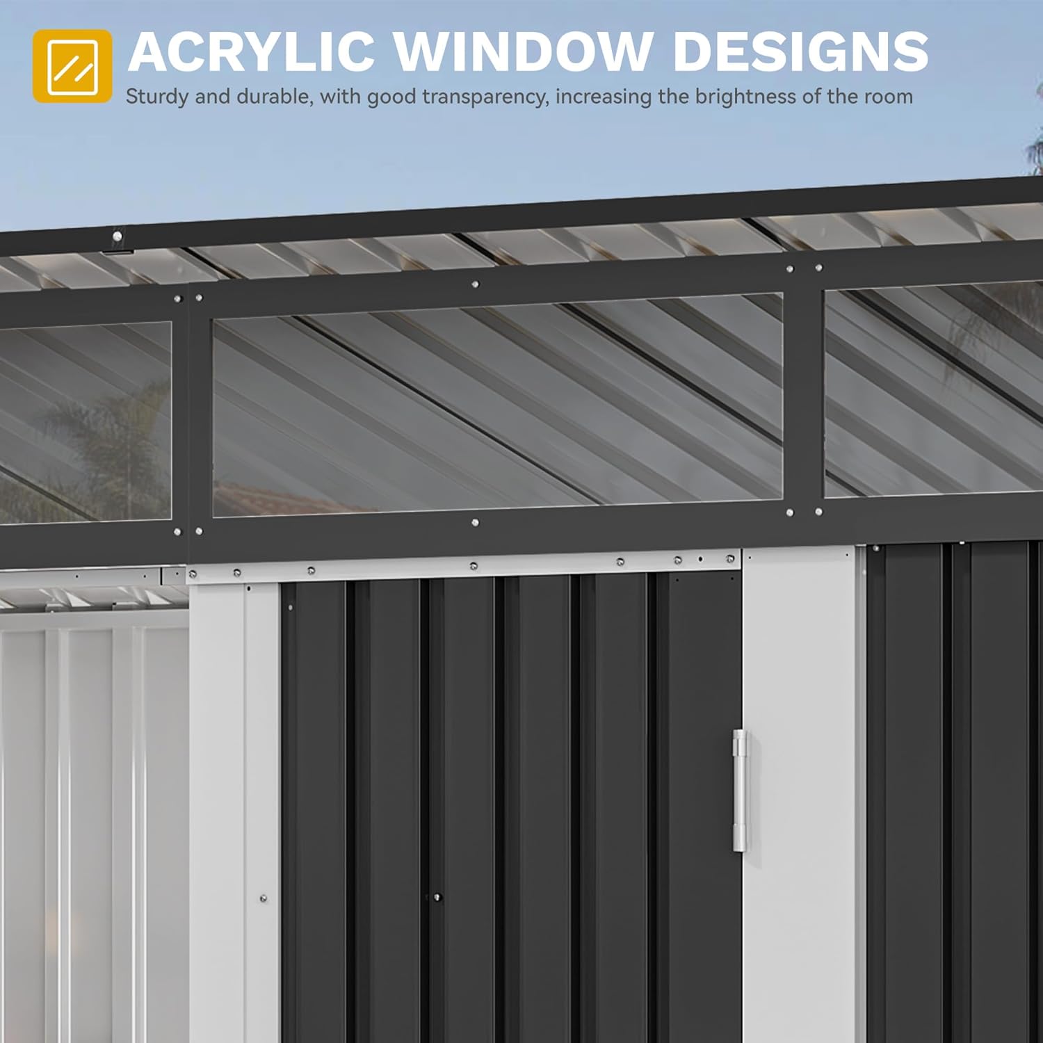 - Practical Roof Slope: Our bike storage shed boasts a sloped roof that effectively prevents rainwater buildup; Equipped with four acrylic transparent windows, effortlessly view the contents inside; Additionally, a spacious door ensures easy access and for large items storage
