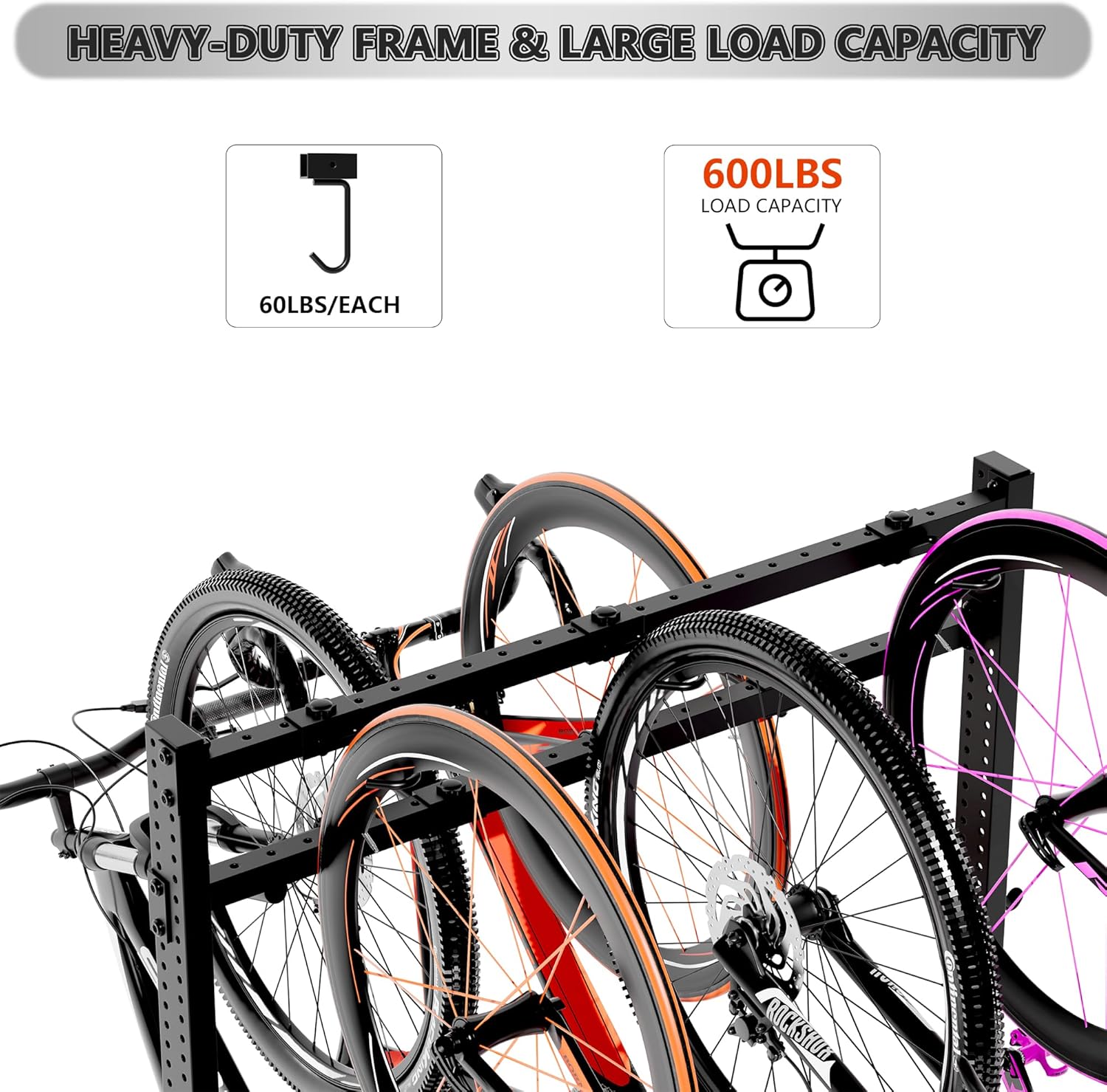 - ☪【Suitable for Most Types of Bikes】:The rack is designed to hold a variety of bicycles, including children's bikes, adult bikes, road bikes and mountain bikes, upright bikes, and electric bikes weighing no more than 60 pounds. Note: When hanging multiple bikes, you need to alternately place the bikes on it with the front wheel facing up/front wheel facing down.