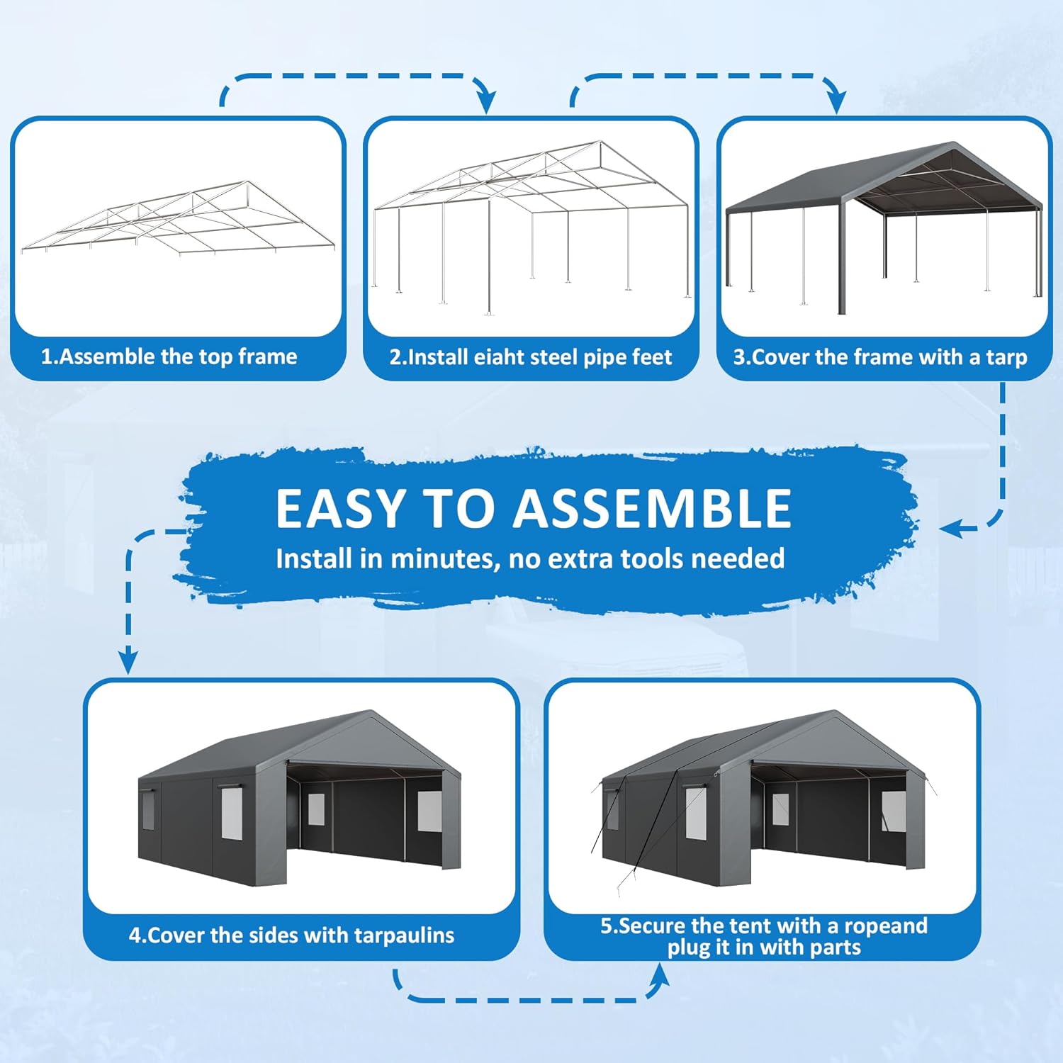 Polar Aurora Carport 20x20 FT, Heavy Duty Car Port Canopy, with 2 Side-Opening Door & Roll-Up Windows, Outdoor Portable Garage for Car, Truck, Boat, Motorcycle