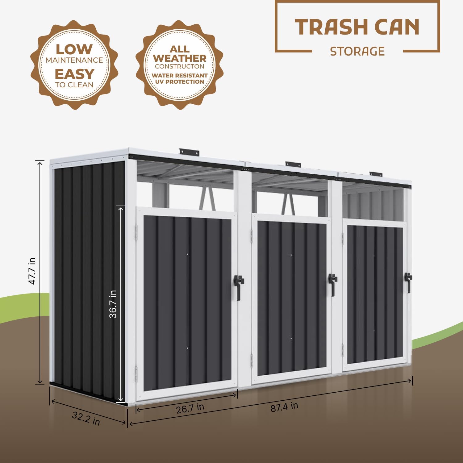 - Space-Saving & Organized Outdoor Solution: Measuring 87.4 inches in length, 32.2 inches in width, and 47.7 inches in height, this compact yet spacious garbage can storage unit efficiently organizes three trash bins in one neat location. It helps to declutter your yard, patio, or driveway, providing a designated and aesthetically pleasing spot for your waste containers within a functional trash can enclosure