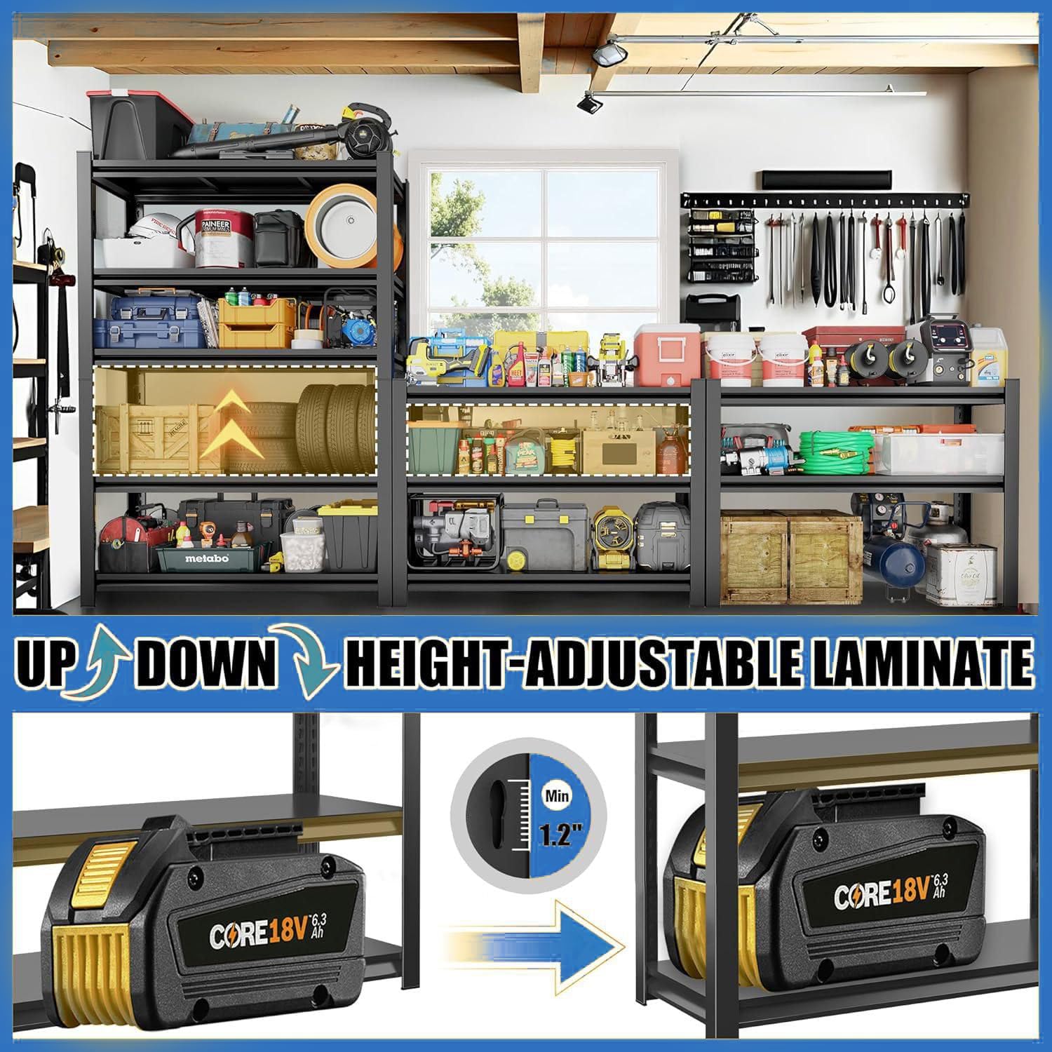 - ăAdjustable Shelving Unit DIY Free CombinationăYou can customize the space according to the size of your items. The metal storage shelves is designed with adjustable connectors. The height of each layer can be adjusted by moving the crossbars up and down to accommodate objects of different heights. You can also divide one shelf into two separate shelves to meet different garage storage needs.