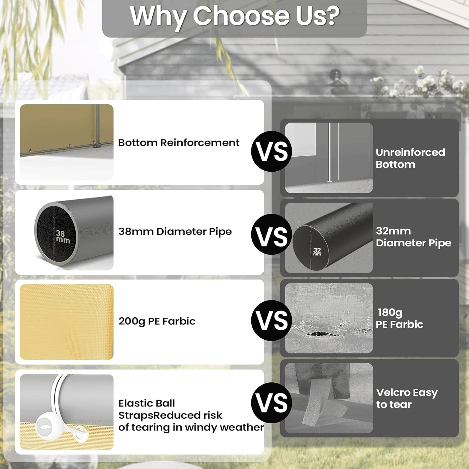 - ELASTIC CORD ATTACHMENT: 2 sidewalls each with 4 PVC transparent viewing windows with roll-up/down self-locking flaps. The elastic cord attached sidewalls make it more stable in windy conditions and reduce the risk of being torn down