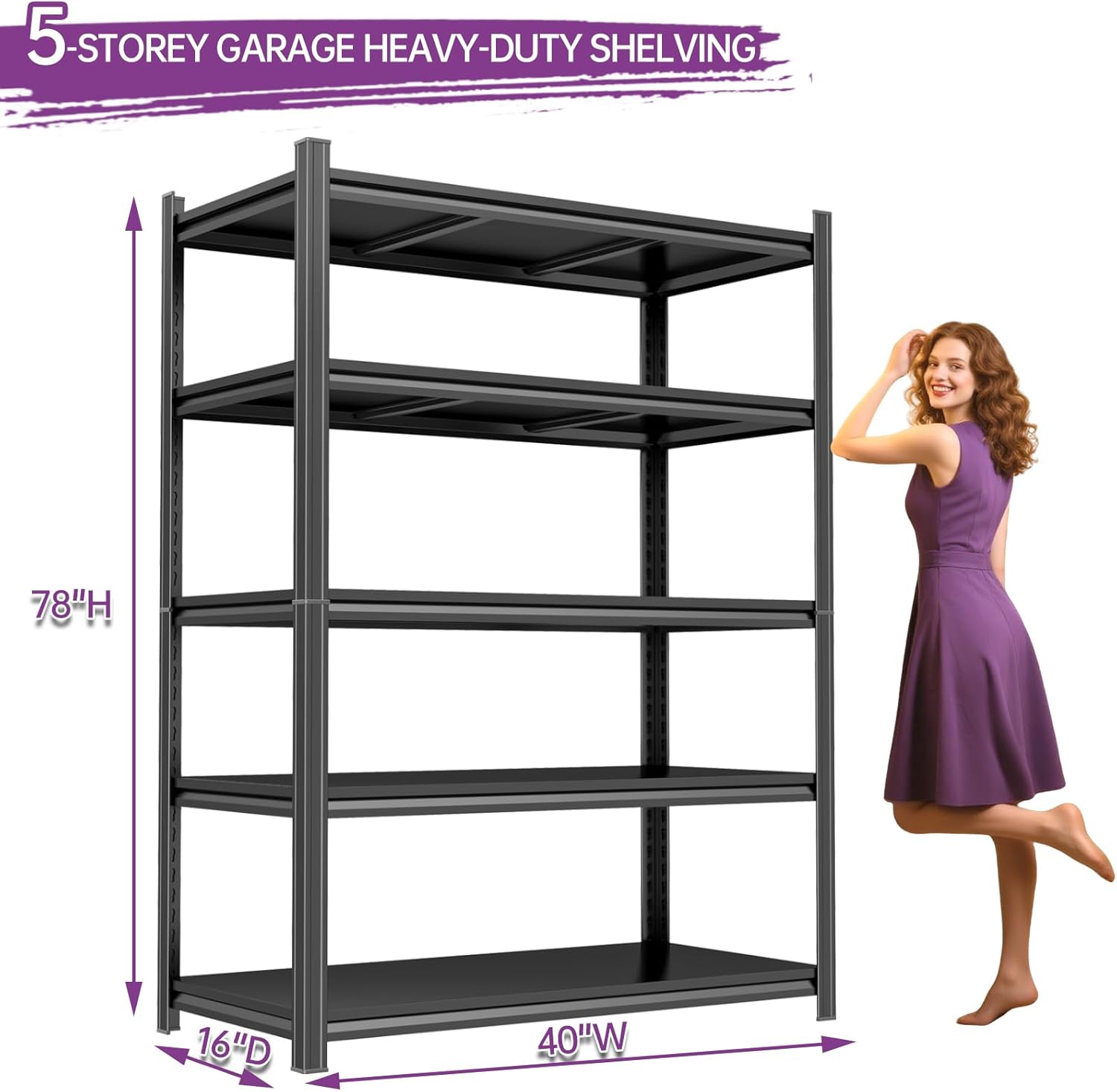 - ă78âHĂ40âWĂ16âD for multiple applicationsăThis garage storage shelves is the perfect size for garages, storage rooms, warehouses, basements, offices, supermarkets, commercial institutions, schools, and libraries. Its 5-tier 78âH metal structure maximizes your storage capacity, providing efficient organization for a variety of items and helping to keep your home or workplace neat and tidy.