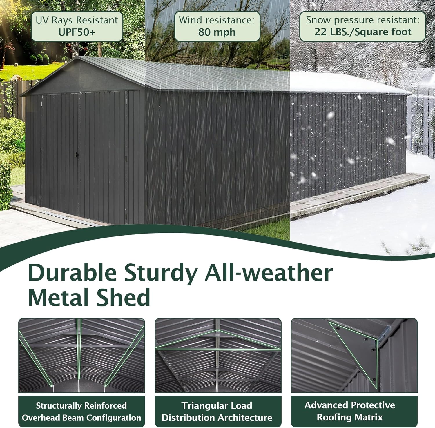 - Premium Powder-Coated Steel Construction - Our garage features thicker 0.32mm steel panels with advanced powder coating that provides superior protection against rust, UV rays (UPF 50+ blocks 99% of UV), and extreme weather conditions. Built to withstand 80 MPH winds and 22 lbs/sq.ft snow loads, this durable structure offers an impressive 8+ year outdoor lifespan - nearly triple the longevity of standard painted steel garages.