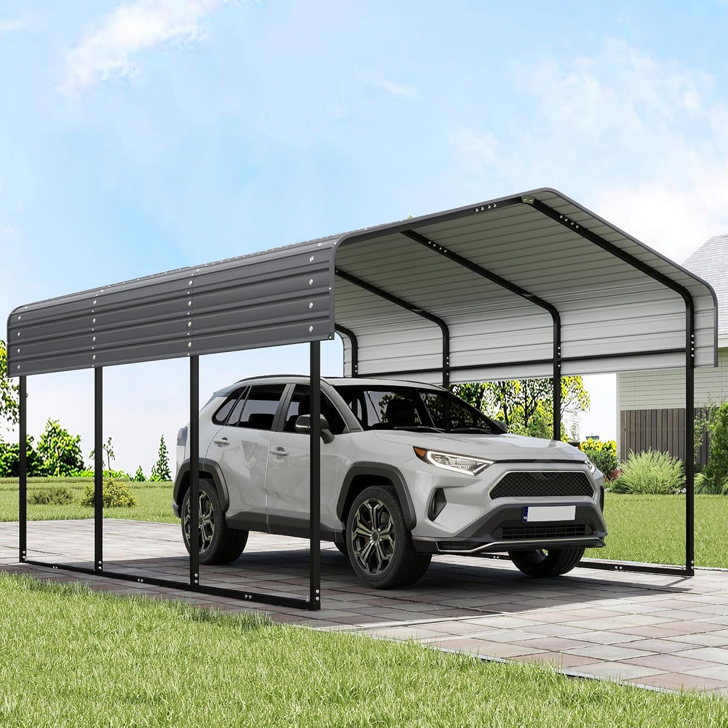 Real Relax 10x15FT Heavy Duty Metal Carport, Outdoor Carport Canopy with Galvanized Steel Roof and Reinforced Base for All-Weather, Garage Shelter Shade for Trucks, Boats, Party, Gray