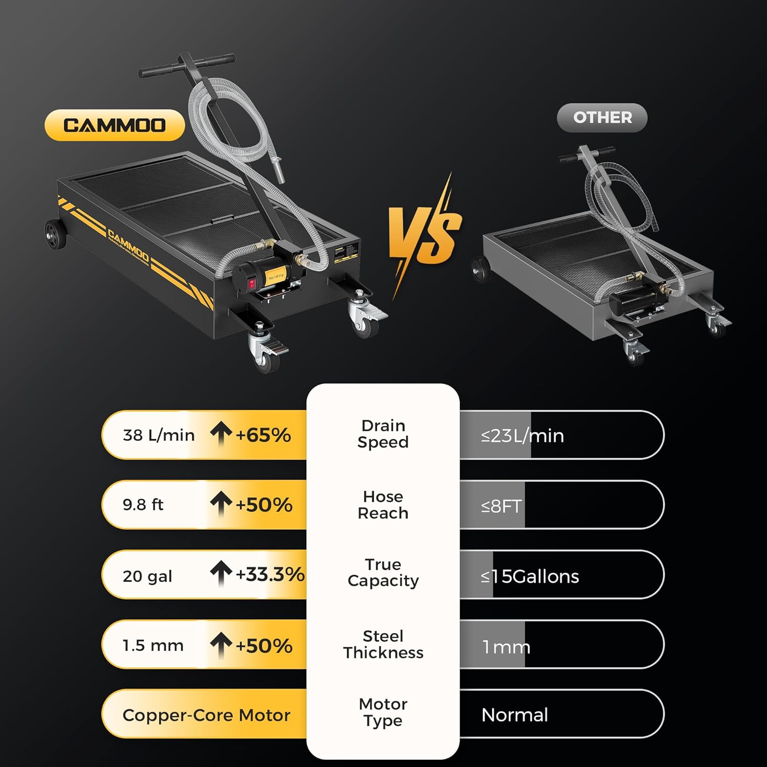 • High Capacity:Oversized 35.4" x 19.7" x 6.7" steel tank delivers a verified 20 gallons and provides a bigger footprint than standard oil drain pans so shop owners, fleet managers, farmers and DIYers can drain a full-size pickup, two RVs or four sedans in one go with less lifting, fewer trips to the recycler and more time for paid jobs. It works with all common waste oils (motor, hydraulic, etc.)—gasoline explicitly excluded.